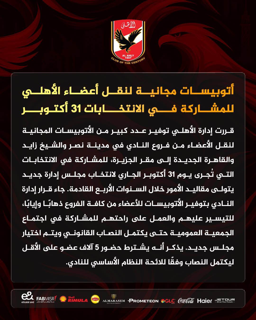 الأهلي: أتوبيسات مجانية لنقل أعضاء النادي للمشاركة في الانتخابات يوم 31 أكتوبر