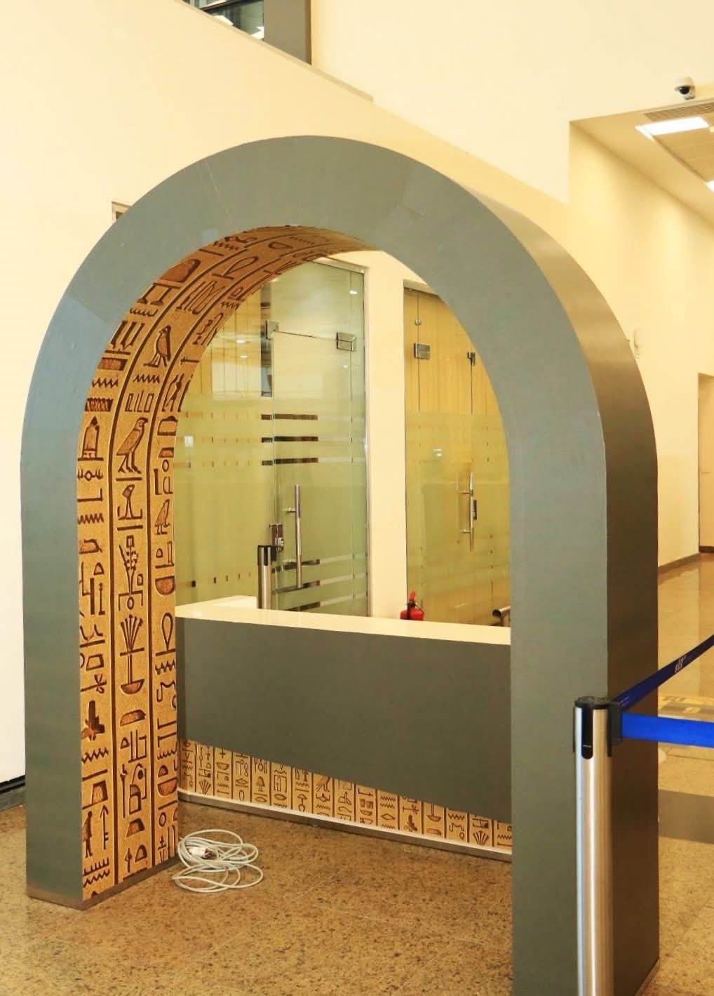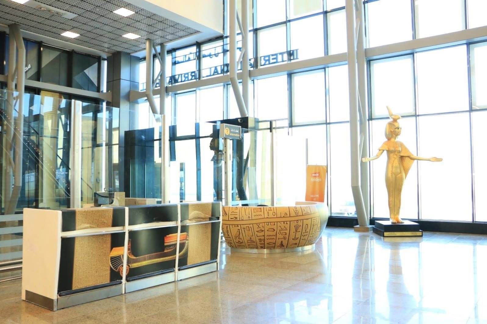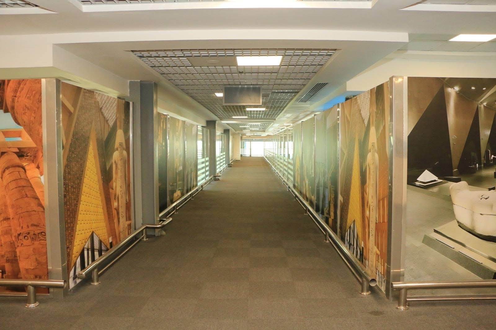 وفي الداخل، اكتسب المطار طابعًا فنيًا مميزًا مستوحى من روح المتحف المصري الكبير، حيث تتزين الصالات والممرات بعناصر تصميمية مستلهمة من النقوش والرموز الفرعونية، ليغدو المطار امتدادًا بصريًا وثقافيًا للمتحف، في مشهد يجمع بين عراقة الماضي وحداثة الحاضر.