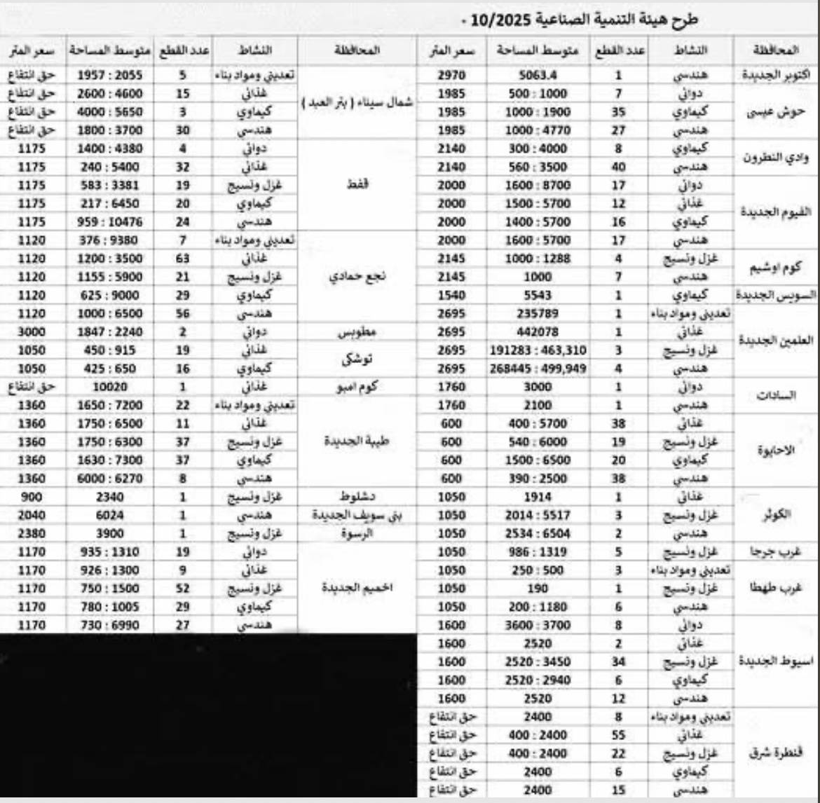 - طرح 9 قطع أراضٍ صناعية موزعة كالتالي: 1 قطعة أرض بنشاط تعديني ومواد بناء (235,789 م²) بسعر 2695 جنيهًا. 1 قطعة أرض بنشاط غذائي (442,078 م²) بسعر 2695 جنيهًا. 3 قطع أراضي بنشاط غزل ونسيج (191,283–463,310 م²) بسعر 2695 جنيهًا. 4 قطع أراضي بنشاط هندسي (268,445–499,949 م²) بسعر 2695 جنيهًا.