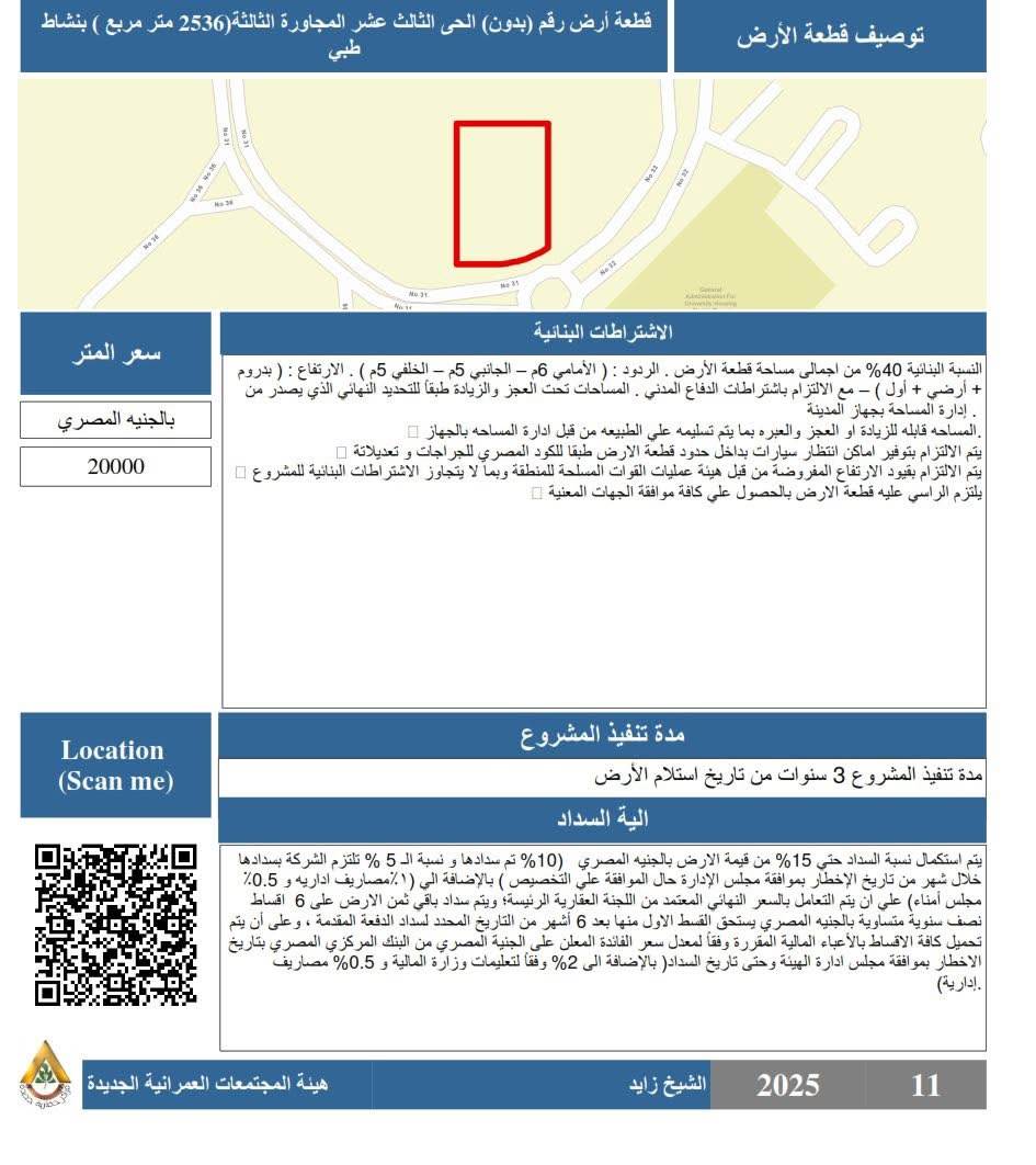 كما يشمل الطرح قطعة أرض بالحي الثالث عشر – المجاورة الثالثة، بمساحة 2536 مترًا مربعًا، مخصصة لنشاط طبي بسعر 20,000 جنيه للمتر.