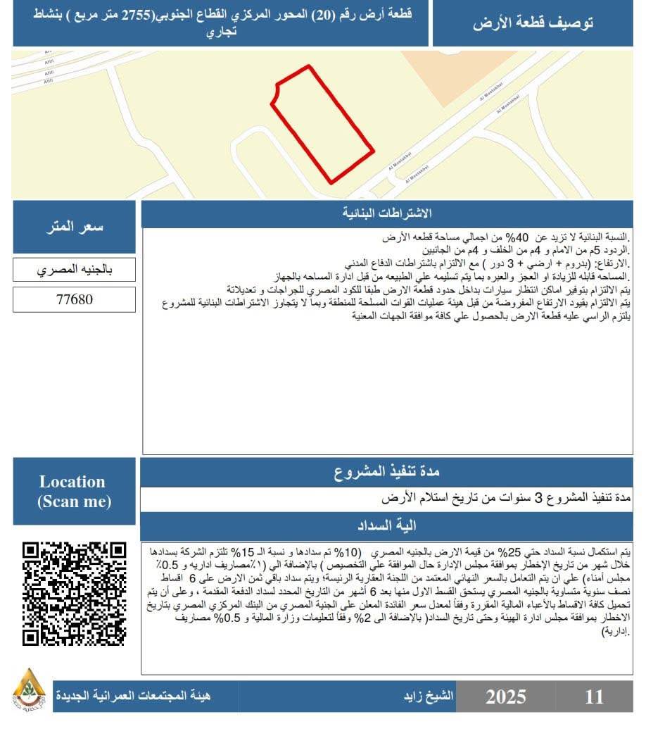 أوضحت رئيس جهاز مدينة الشيخ زايد، أن الأراضي المطروحة تشمل: قطعة أرض رقم (20) بالمحور المركزي بالقطاع الجنوبي، بمساحة 2755 مترًا مربعًا، مخصصة لنشاط تجاري بسعر 77,680 جنيهًا للمتر.