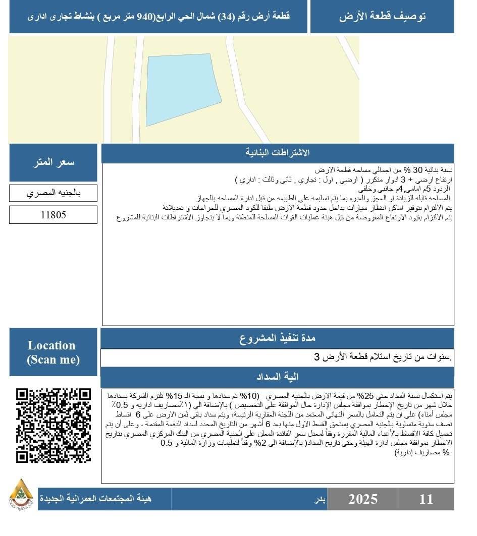 - قطعة رقم (34) شمال الحي الرابع، بمساحة 940 م²، نشاط تجاري إداري، بسعر 11805 جنيهات للمتر، بنسبة بنائية 30% من إجمالي المساحة.