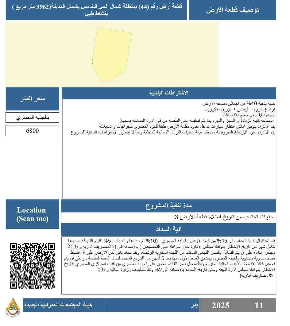 - قطعة رقم (44) بمنطقة شمال المدينة، بمساحة 3962 م²، نشاط طبي، بسعر 6800 جنيه للمتر، بنسبة بنائية 40% من إجمالي المساحة.