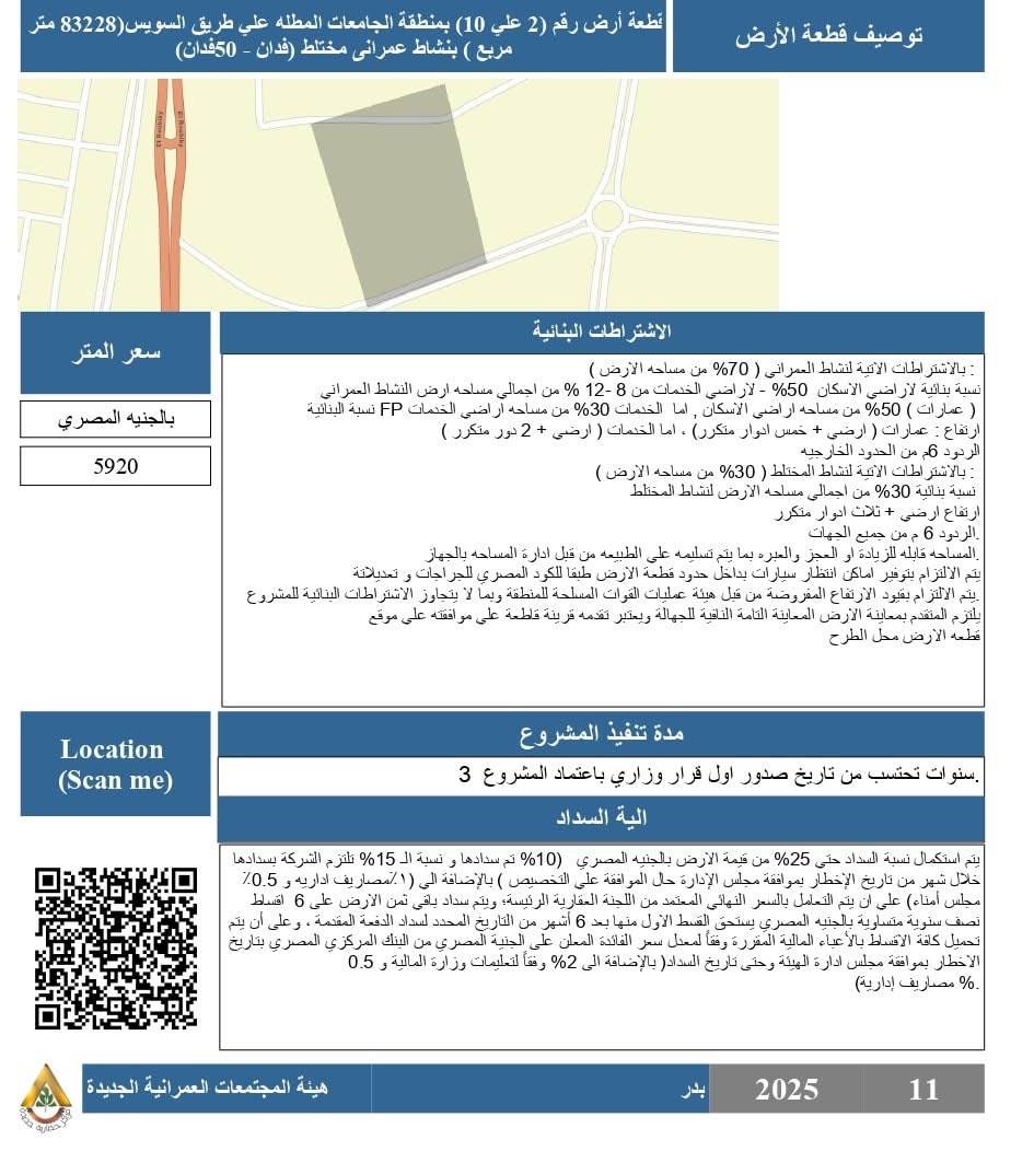 - قطعة رقم (2 على 10) بمنطقة الجامعات المطلة على طريق السويس، بمساحة 83228 م²، نشاط عمراني مختلط، بسعر 5920 جنيهًا للمتر، بنسبة بنائية 50% للإسكان و30% للخدمات.