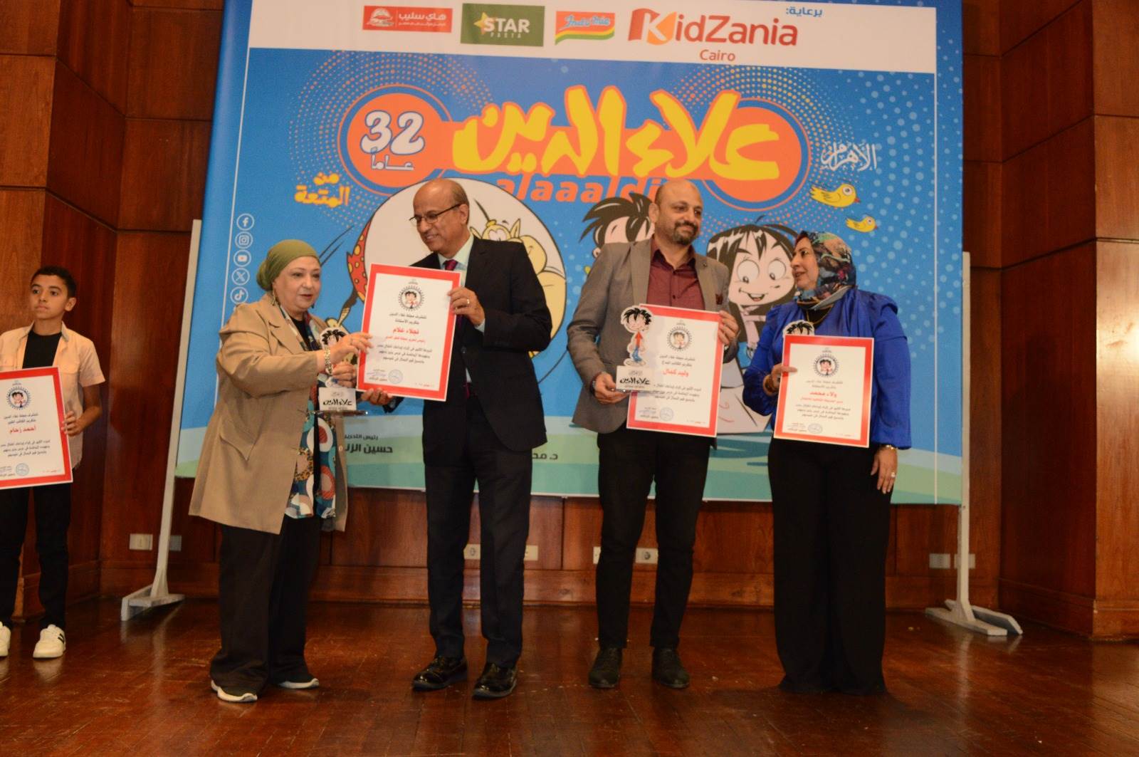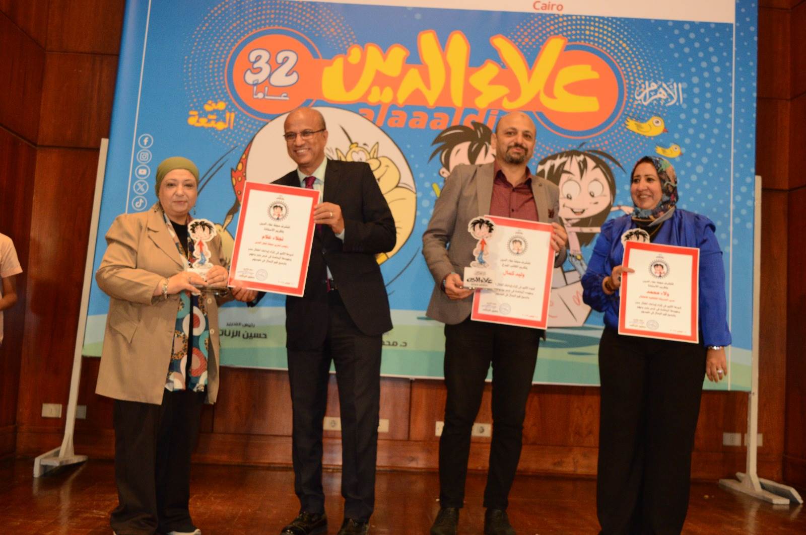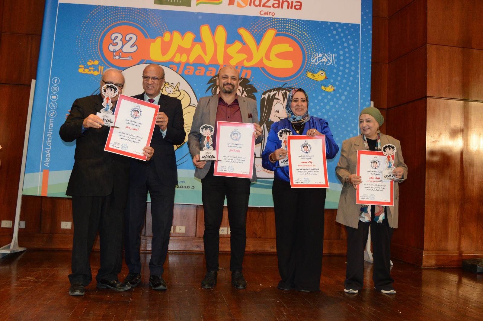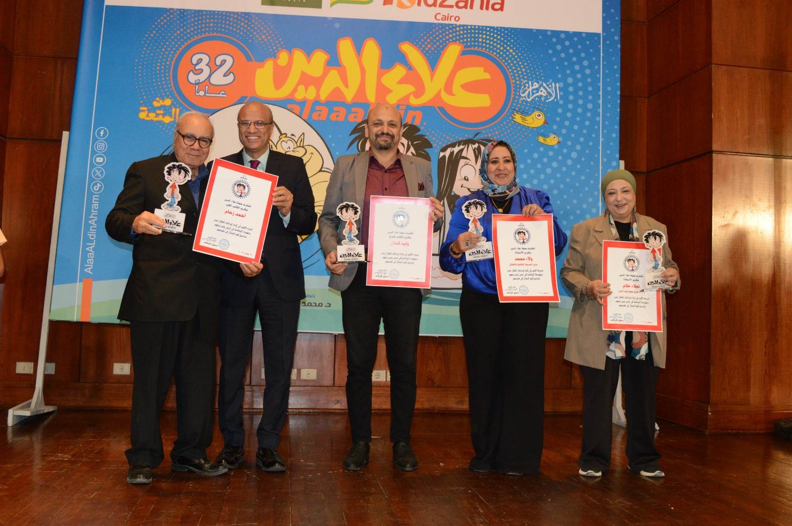كرمت مجلة علاء الدين في احتفاليتها بأعياد الطفولة، برئاسة تحريرها الكاتب الصحفي حسين الزناتي، عددًا من الشخصيات البارزة التي ساهمت في إثراء المحتوى الثقافي ودعم الإبداع الموجّه للأطفال. وشمل التكريم كلًا من ولاء محمد، مدير الحديقة الثقافية بالسيدة زينب، والكاتب المبدع وليد كمال، ونجلاء علام، رئيس تحرير مجلة قطر الندى، والكاتب الكبير أحمد زحام، أحد أوائل الكتّاب الذين أثروا مجلة علاء الدين بكتاباتهم. وجاء هذا التكريم تقديرًا لإسهاماتهم المتميزة ودورهم في دعم الإبداع وتنمية المواهب.