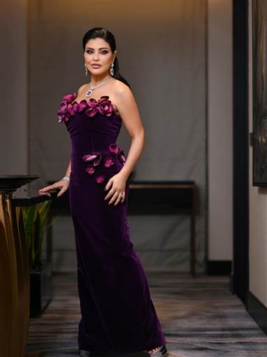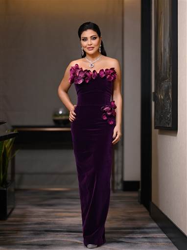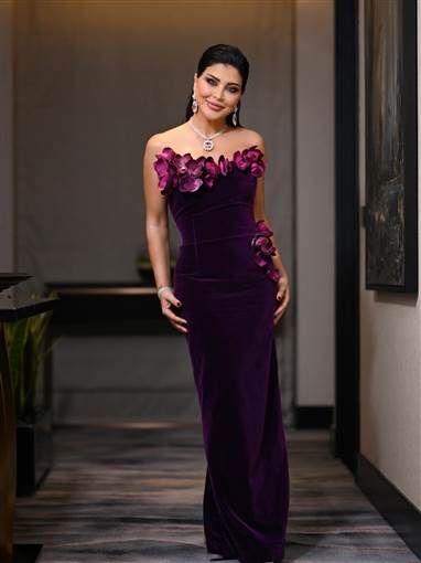استعرضت جومانا مراد إطلالتها المميزة، حيث ارتدت فستانًا مخمليًا باللون البنفسجي الغامق مكشوف الكتفين مع تفاصيل في منطقة الصدر والخصر على شكل زهرة الأوركيد.