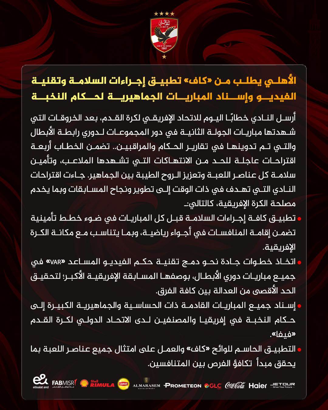 تضمن خطاب الأهلي أربعة اقتراحات عاجلة تهدف إلى الحد من الانتهاكات داخل الملاعب، وتأمين سلامة اللاعبين، وتعزيز الروح الرياضية بين الجماهير، بالإضافة إلى تطوير المسابقات بما يخدم مصلحة الكرة الإفريقية: