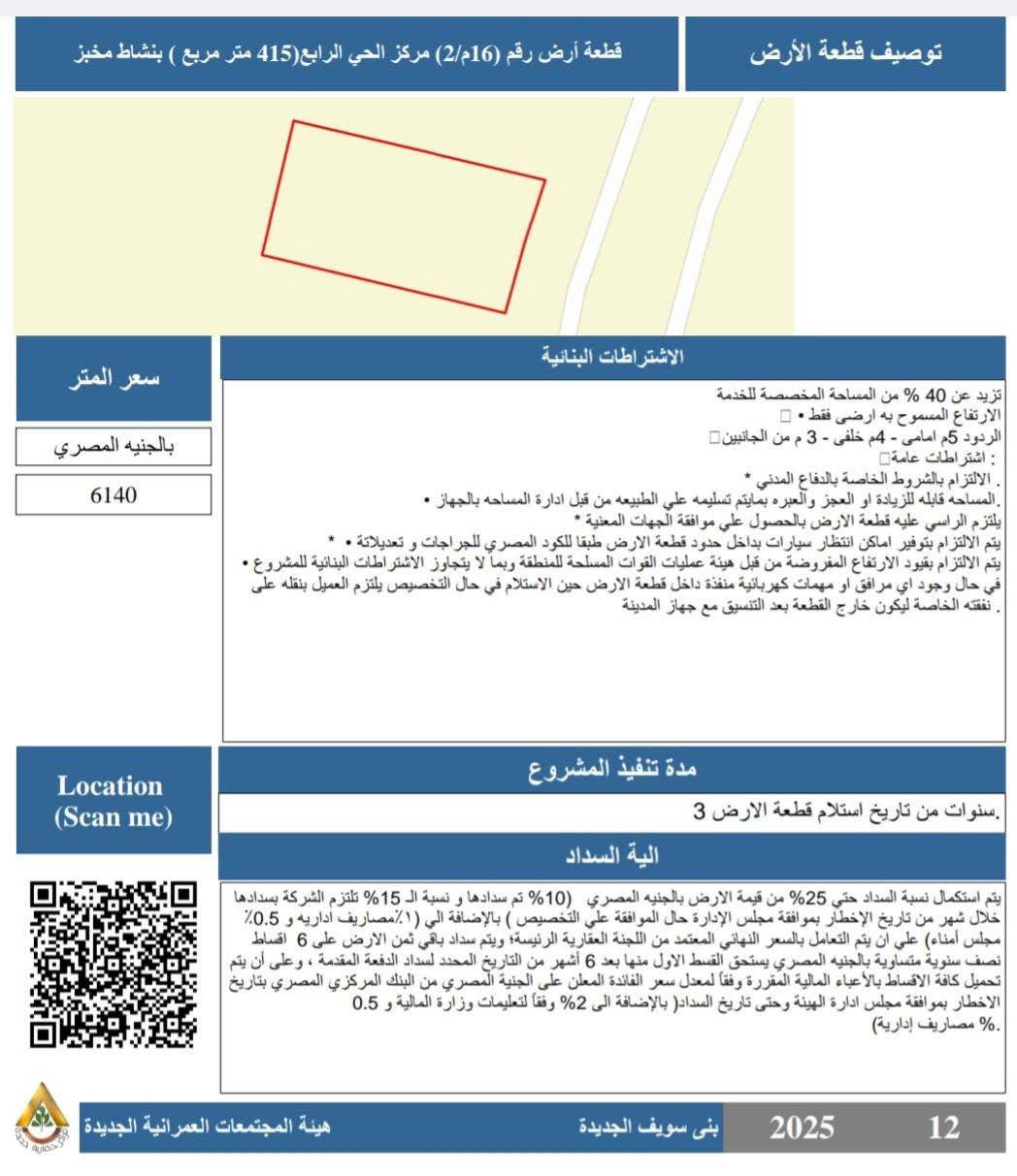 - قطعة أرض رقم (16م/2) بمركز الحي الرابع بمساحة 415 متر مربع بنشاط مخبز، بسعر 6140 جنيهًا للمتر، وبنسبة بنائية لا تزيد عن 40٪.