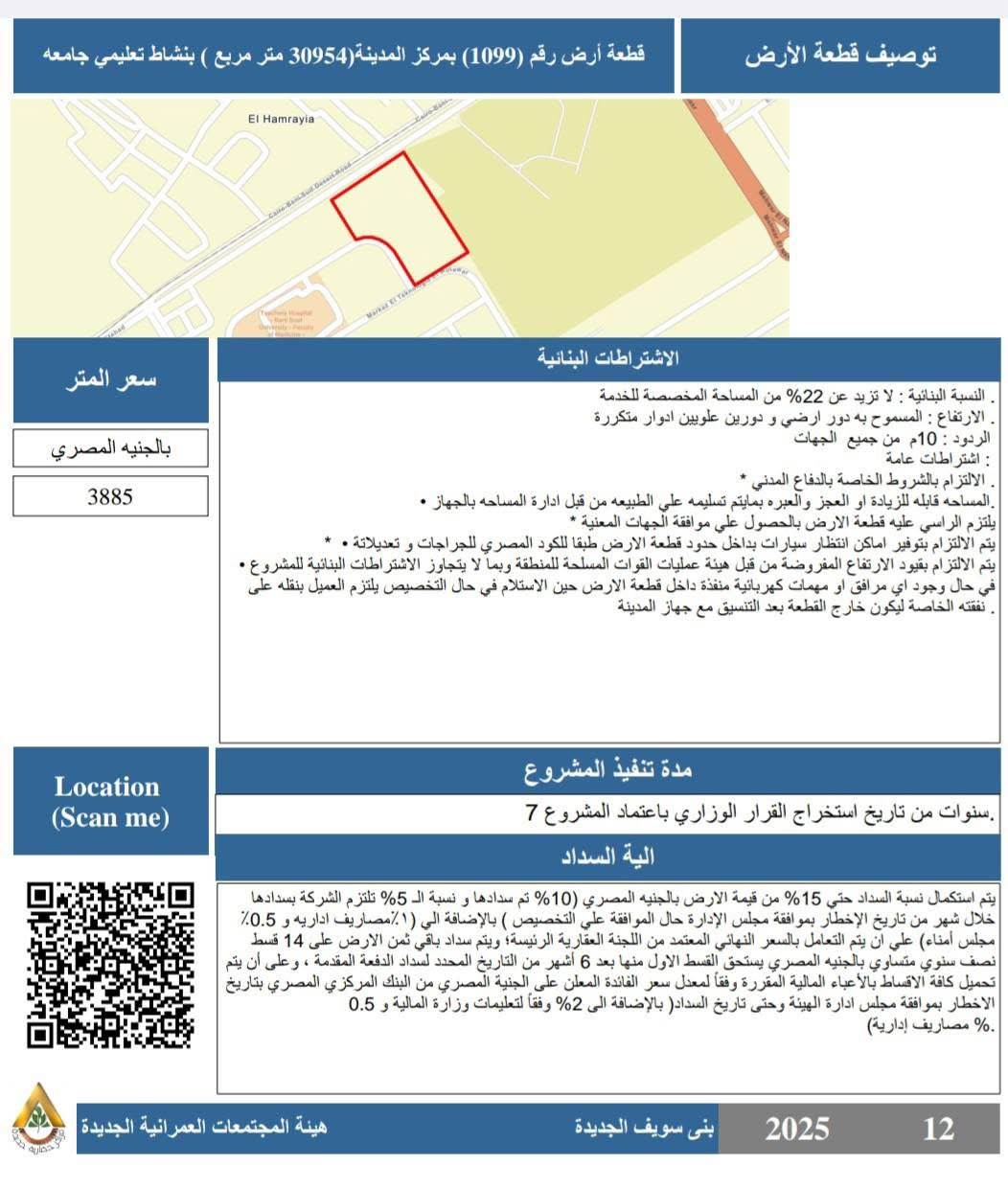 - قطعة أرض رقم (1099) بمركز المدينة بمساحة 30,954 متر مربع بنشاط تعليمي (جامعة)، بسعر 3885 جنيهًا للمتر، وبنسبة بنائية لا تزيد عن 22٪، على أن يتم تنفيذ المشروع خلال 7 سنوات من تاريخ اعتماد القرار الوزاري.