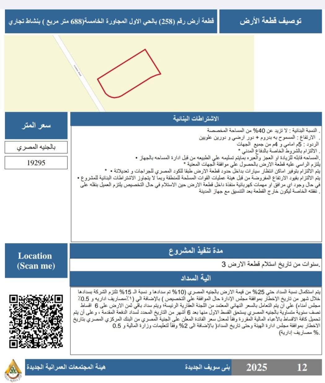 - قطعة أرض رقم (258) بالحي الأول المجاورة الخامسة بمساحة 688 متر مربع بنشاط تجاري، بسعر 19,295 جنيهًا للمتر، وبنسبة بنائية لا تزيد عن 40٪.