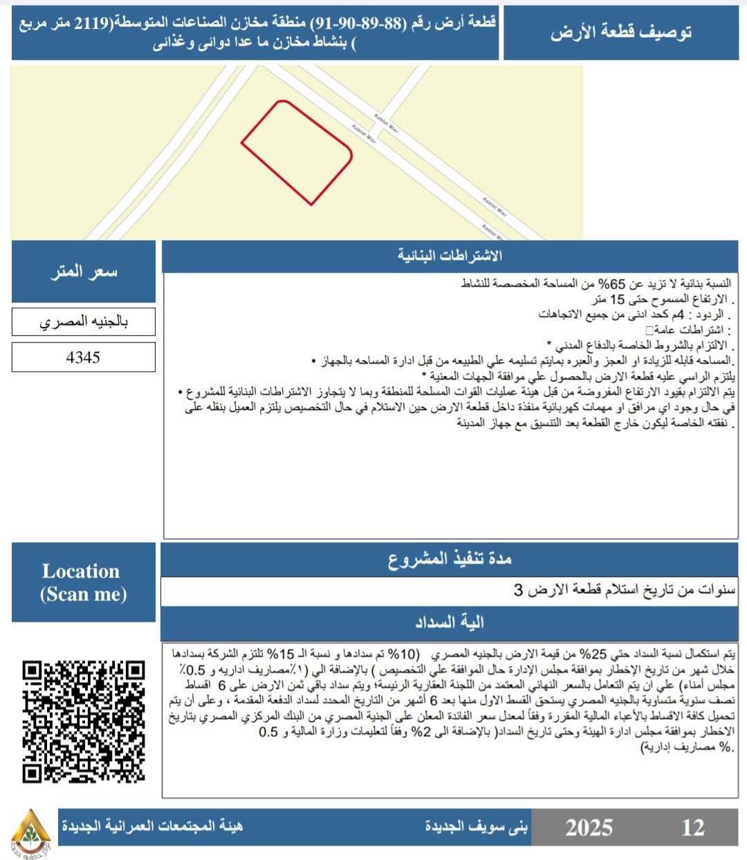 - قطع أراضٍ أرقام (88-89-90-91) بمنطقة مخازن الصناعات المتوسطة بمساحة 2119 متر مربع بنشاط مخازن ما عدا دوائي وغذائي، بسعر 4345 جنيهًا للمتر، وبنسبة بنائية لا تزيد عن 65٪.