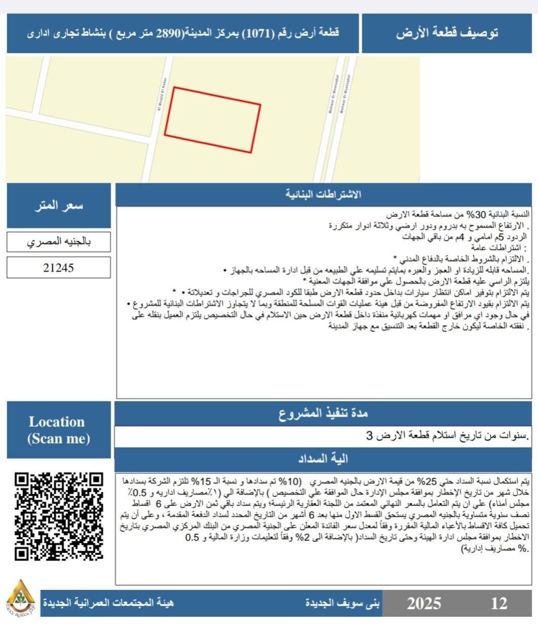 - قطعة أرض رقم (1071) بمركز المدينة بمساحة 2890 متر مربع بنشاط تجاري إداري، بسعر 21,245 جنيهًا للمتر، وبنسبة بنائية لا تزيد عن 30٪.