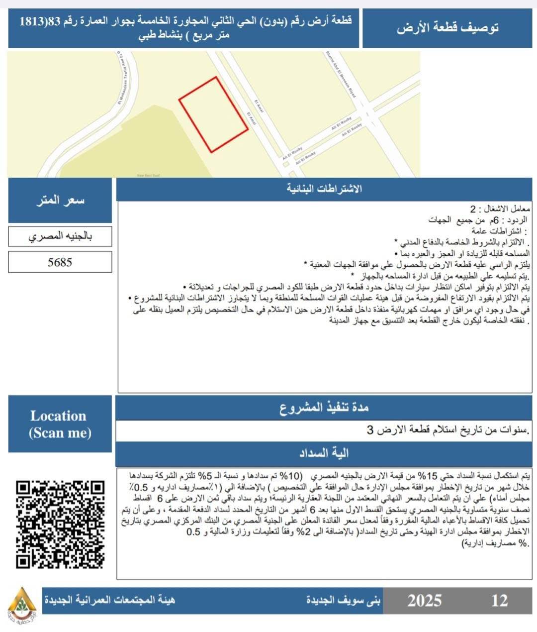 - قطعة أرض بالحي الثاني المجاورة الخامسة بجوار العمارة رقم (1813) بمساحة 83 متر مربع بنشاط طبي، بسعر 5685 جنيهًا للمتر.