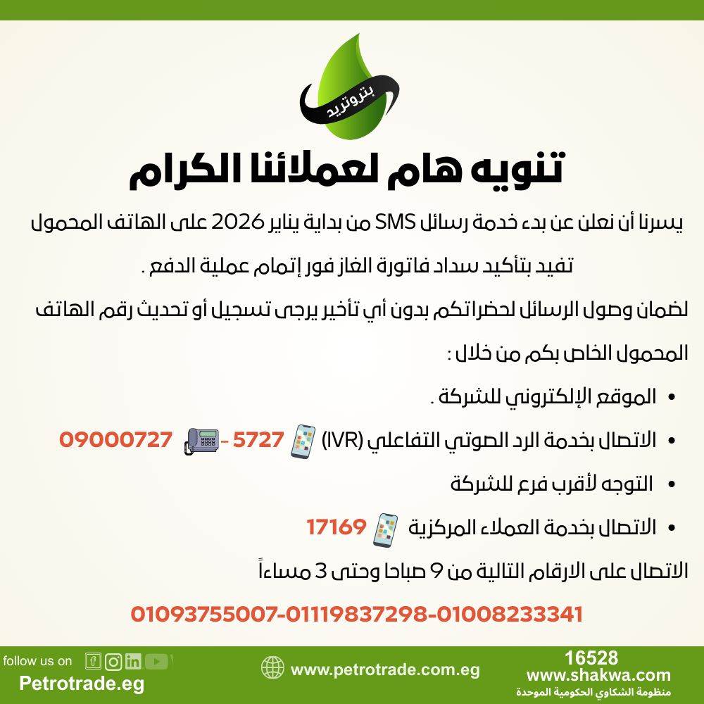 بتروتريد تفعل خدمة الرسائل القصيرة لتأكيد سداد الفواتير