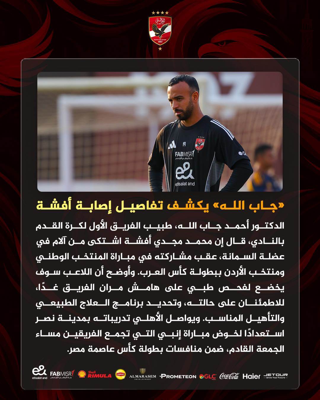 أعلن الدكتور أحمد جاب الله، طبيب الفريق الأول لكرة القدم بالنادي الأهلي، تفاصيل إصابة لاعب الفريق محمد مجدي أفشة التي تعرض لها خلال مشاركته مع المنتخب في بطولة كأس العرب 2025 بقطر.