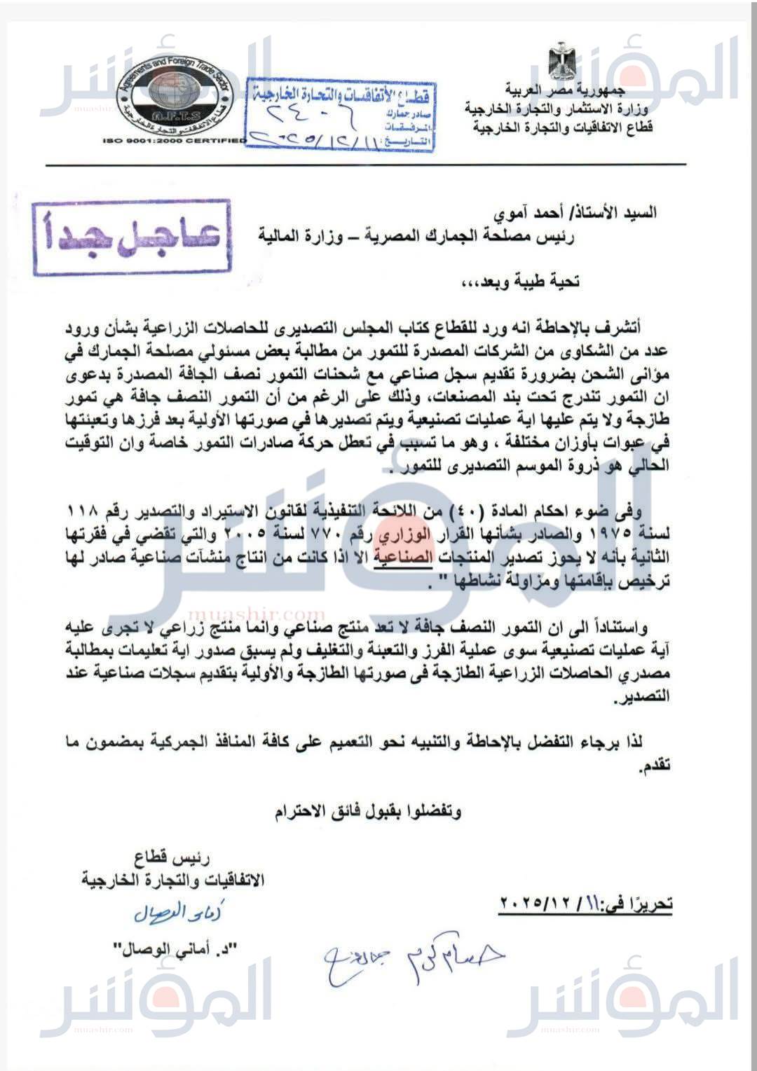 تقدّم قطاع الاتفاقيات والتجارة الخارجية بمذكرة عاجلة إلى رئيس مصلحة الجمارك المصرية بوزارة المالية، أحمد أموي، وذلك بعد تلقيه كتابًا من المجلس التصديري للحاصلات الزراعية بشأن شكاوى متعددة من الشركات المصدّرة للتمور.