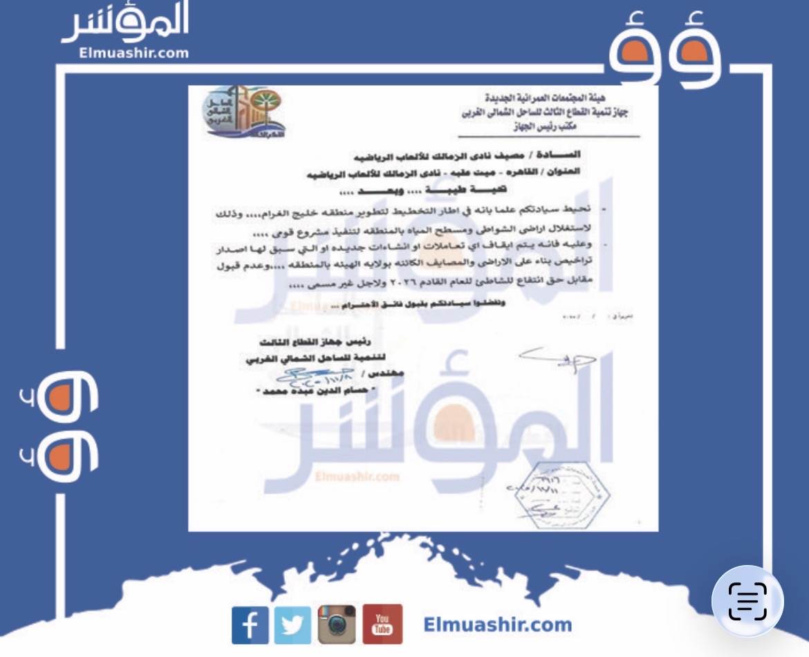 «وتتوالى الأزمات».. «الإسكان» تخطر نادي الزمالك بوقف التعامل على أرض مصيف الساحل الشمالي.. مستند