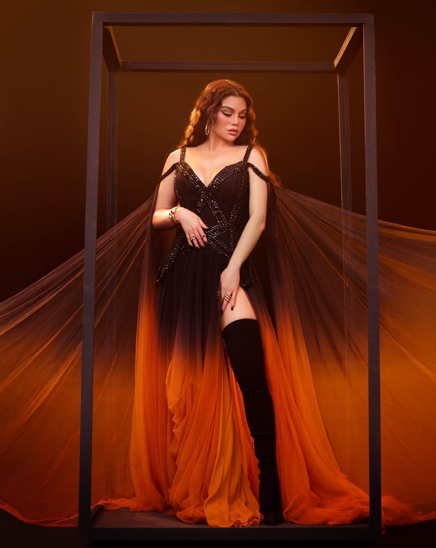 وانسدل الفستان بطبقات من التول المتدرج باللون البرتقالي الدافئ، ما منح الإطلالة حركة درامية وحضورًا لافتًا، بينما أكملت اللوك بحذاء أسود طويل ومجوهرات ناعمة زادت من فخامته