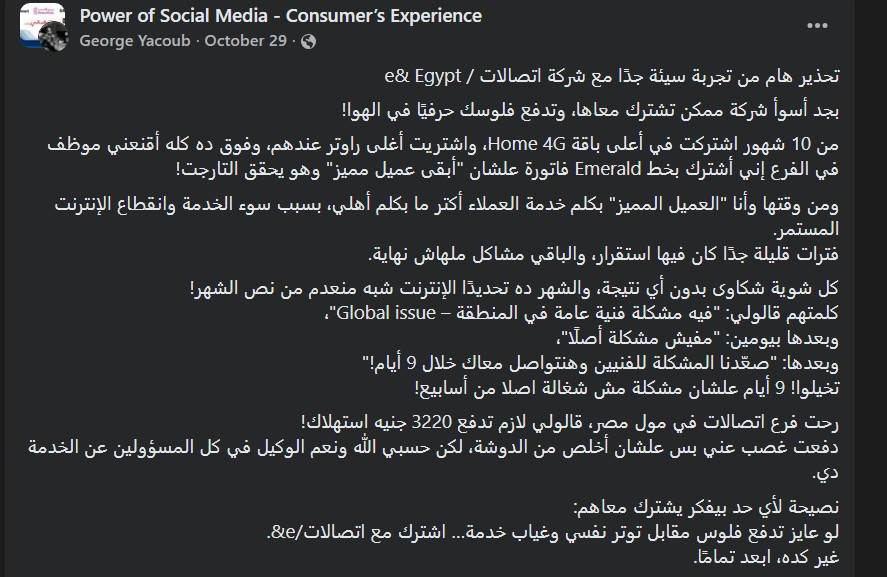 عميل e& Egypt يشكو انقطاع الإنترنت رغم الاشتراك في أعلى الباقات