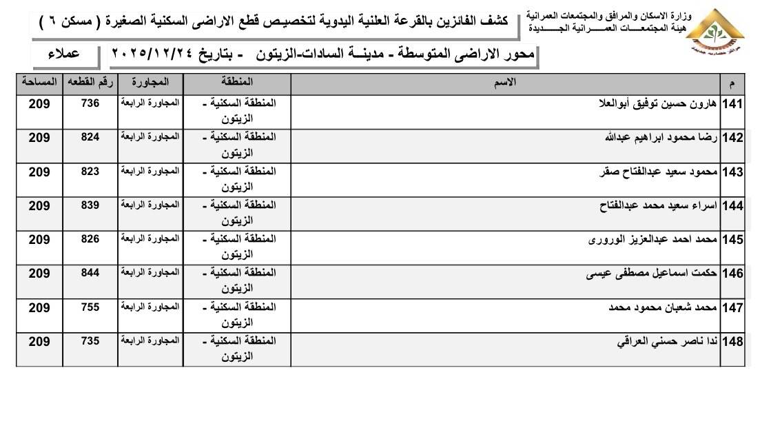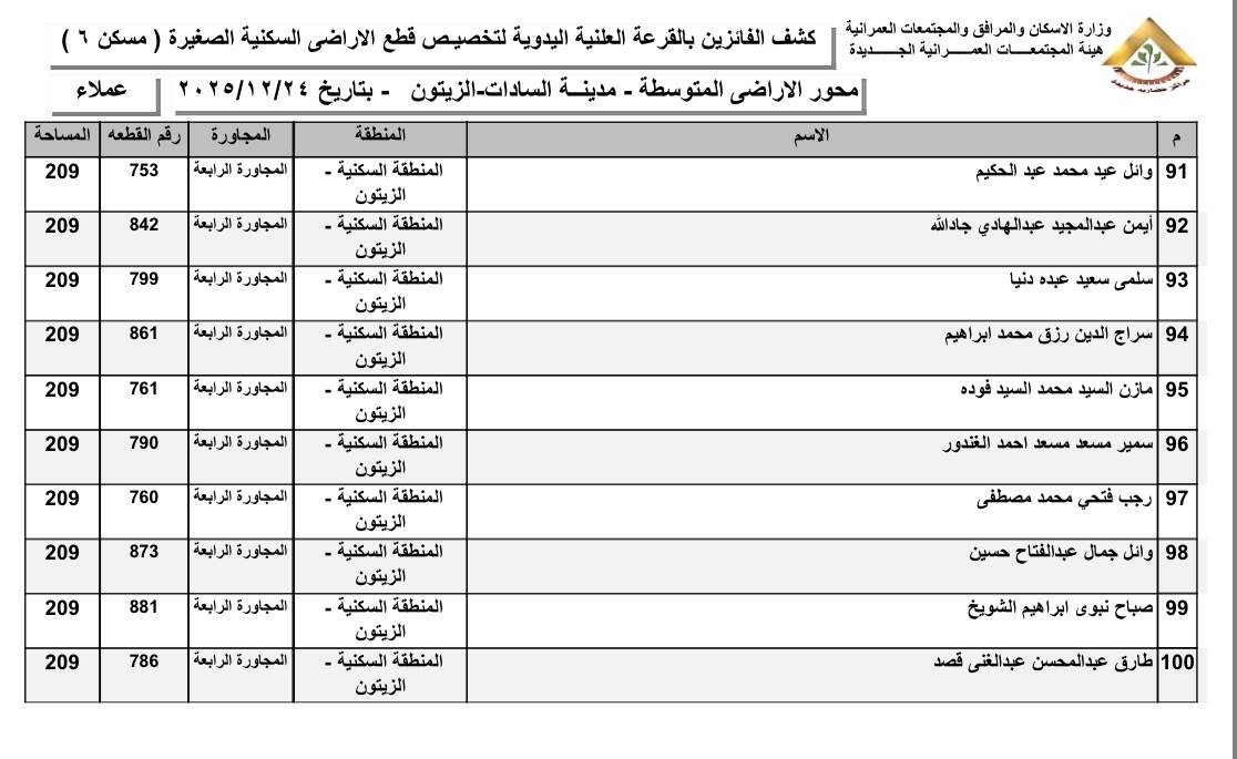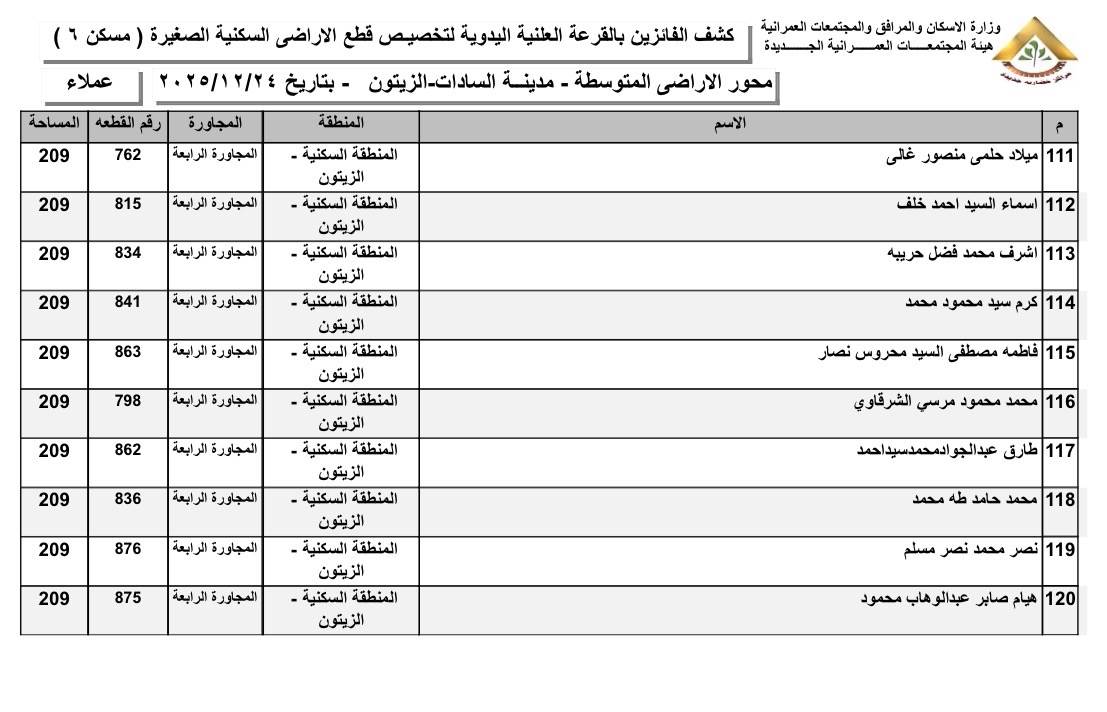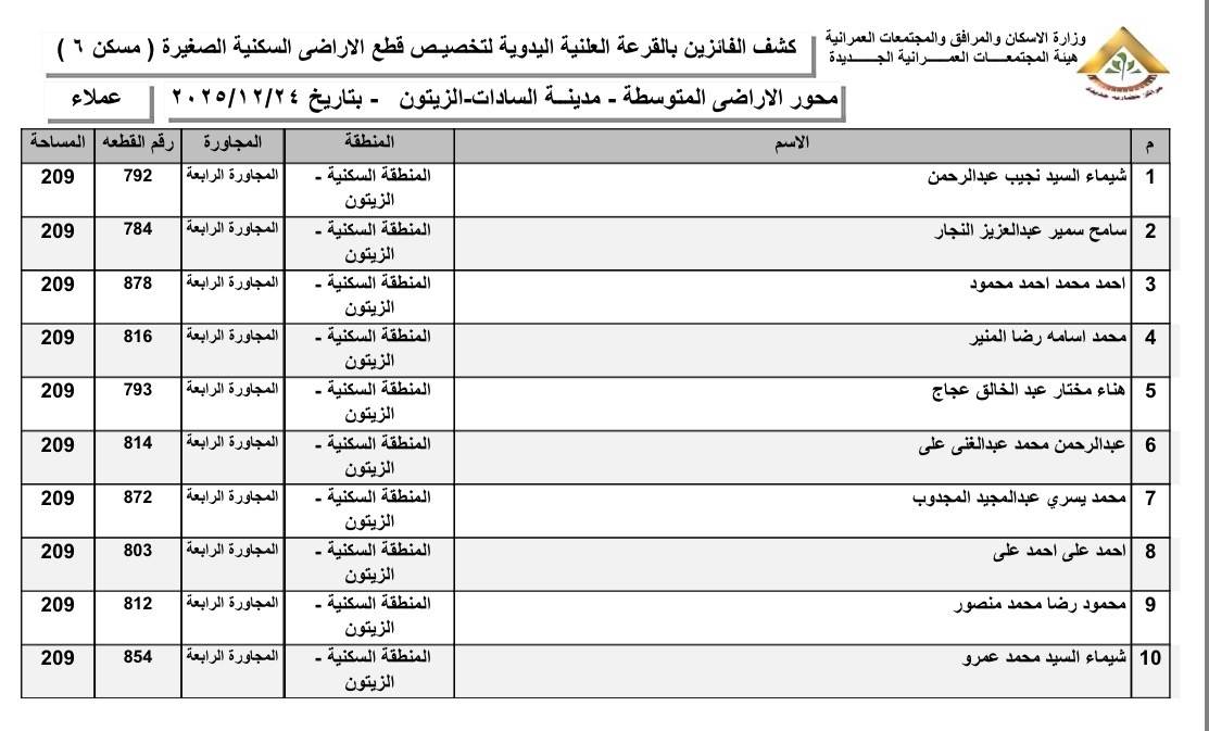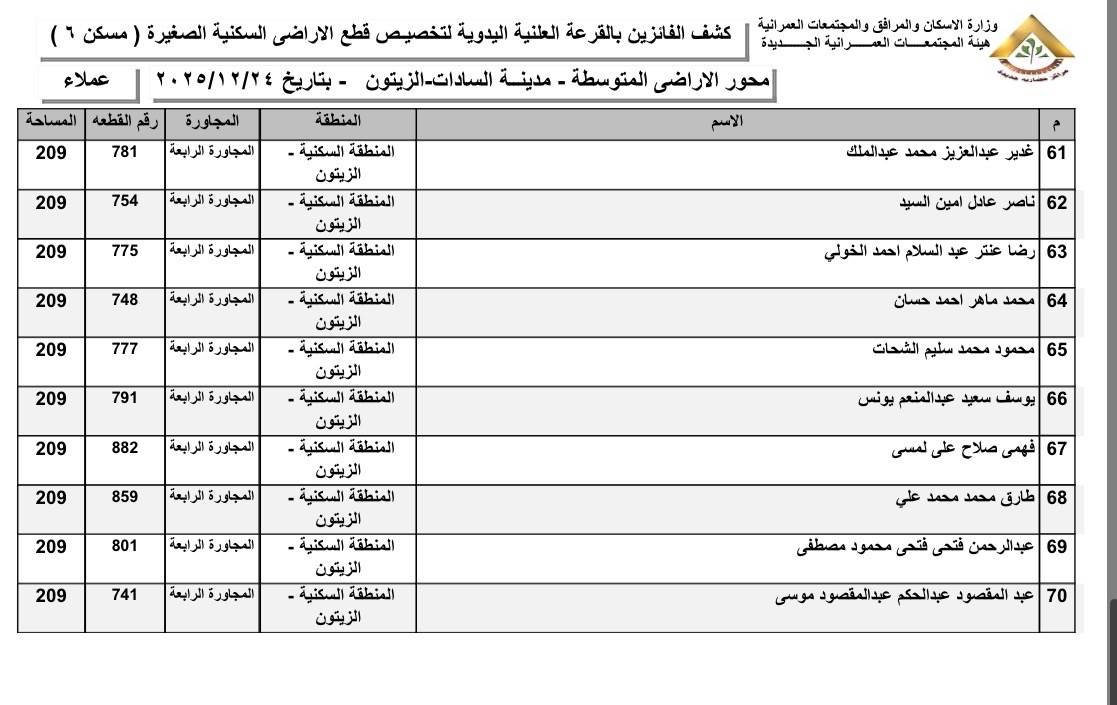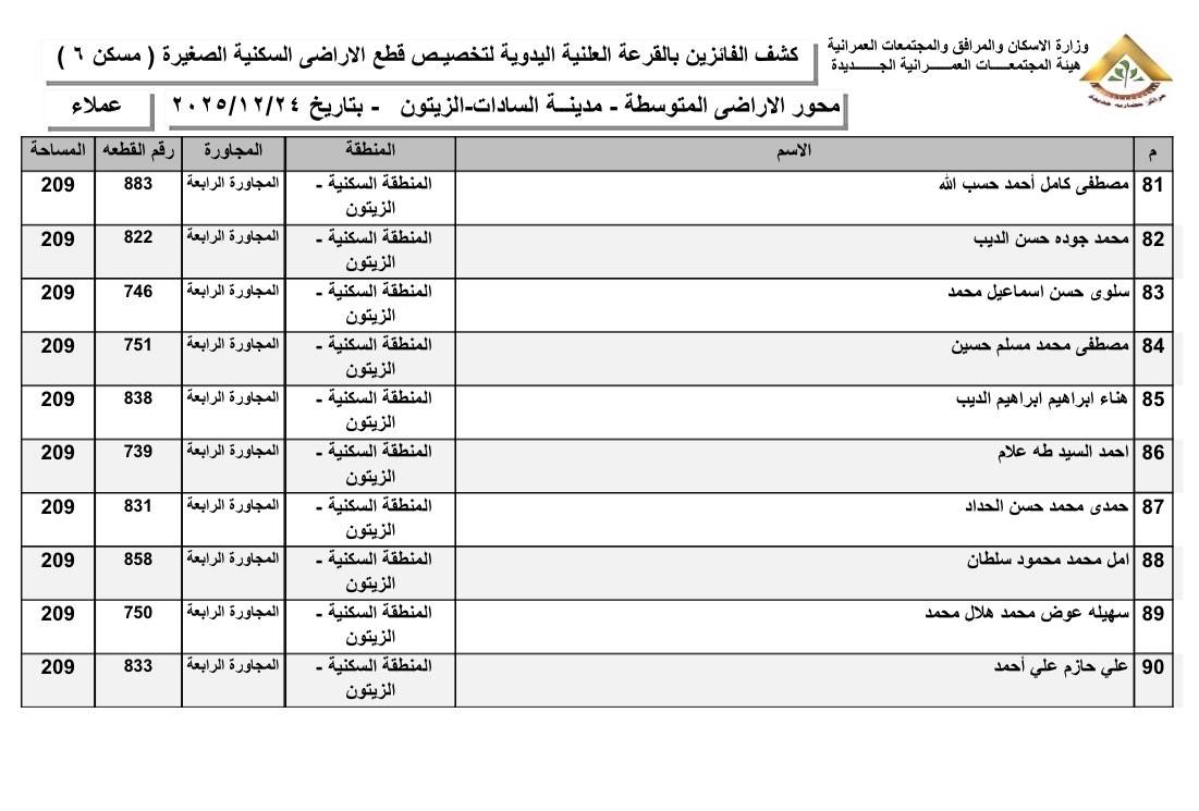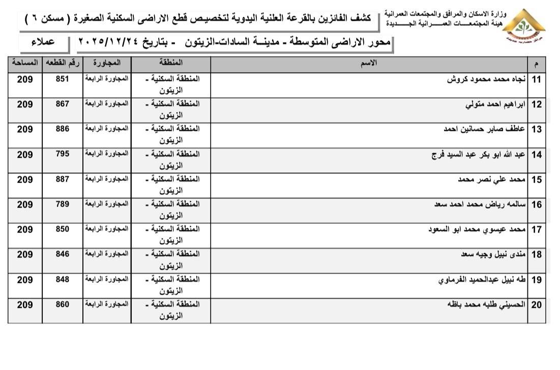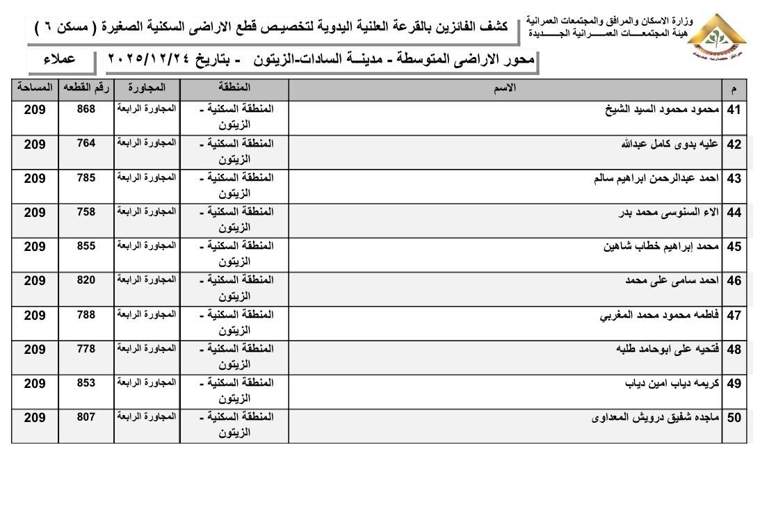 الفائزون بأراضي مسكن الطرح السادس بمدينة السادات بمنطقة الزيتون