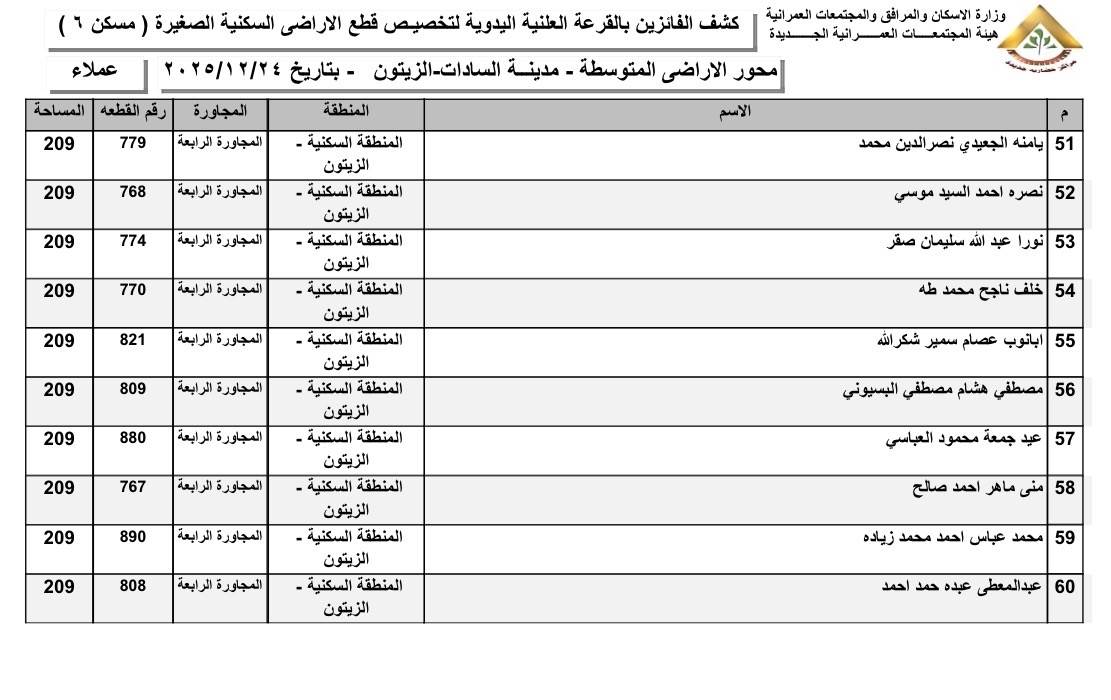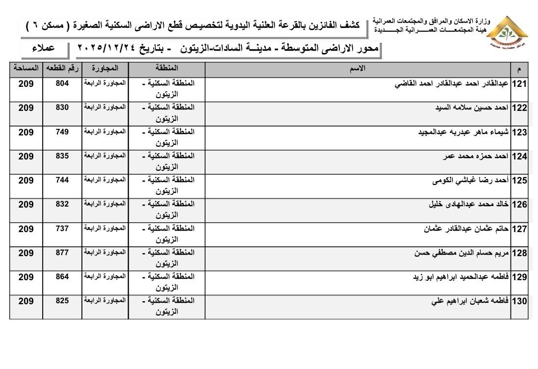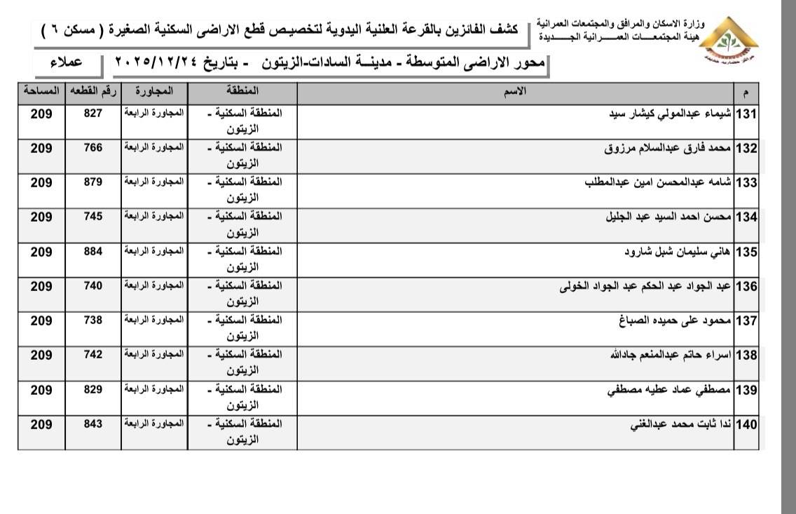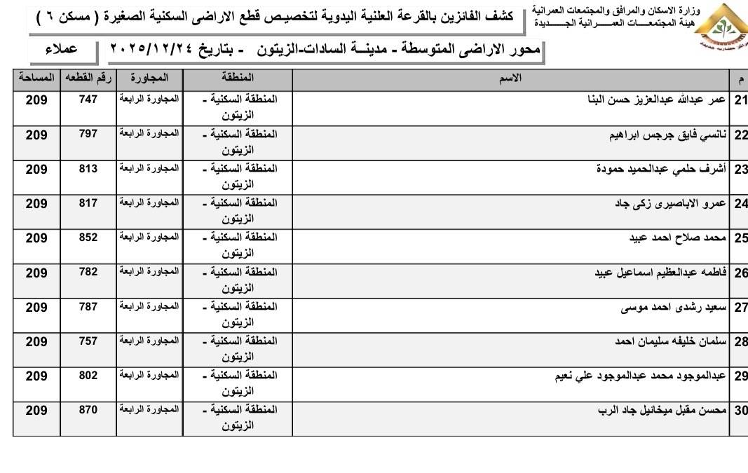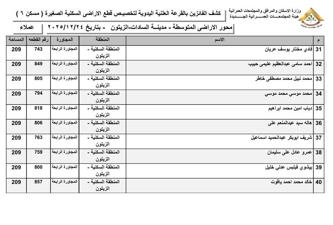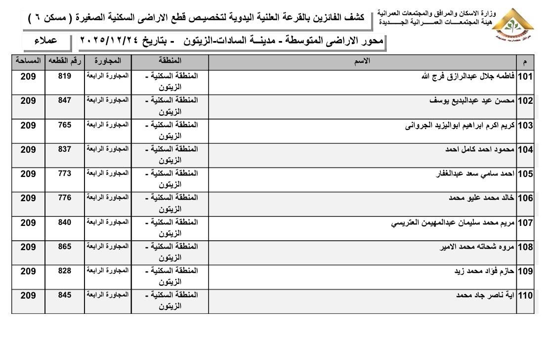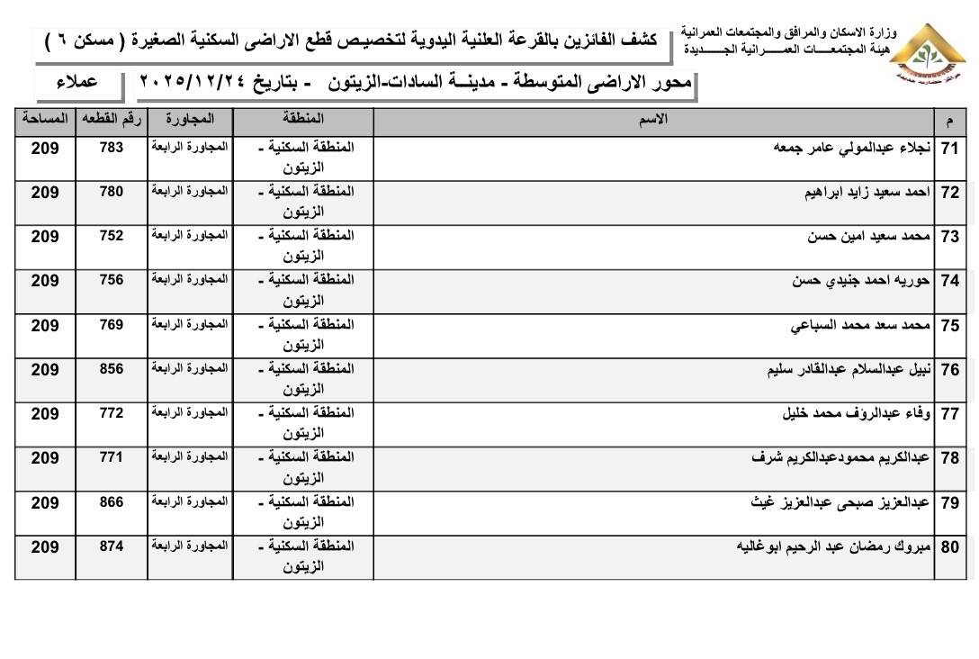 الفائزون بأراضي مسكن الطرح السادس بمدينة السادات بمنطقة الزيتون