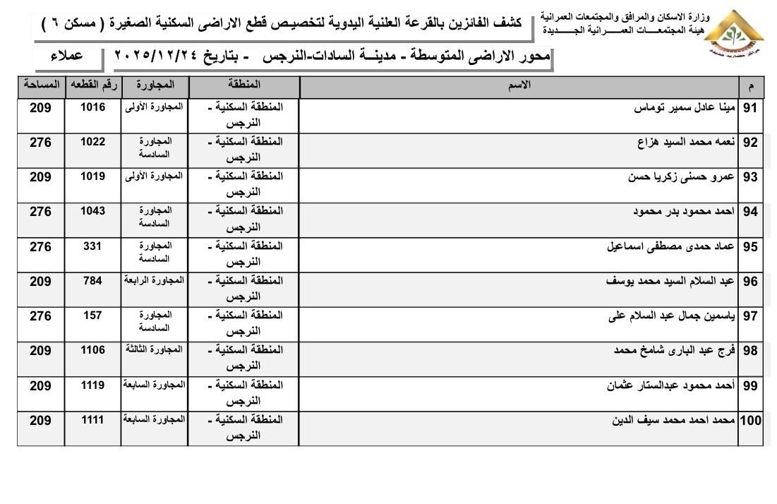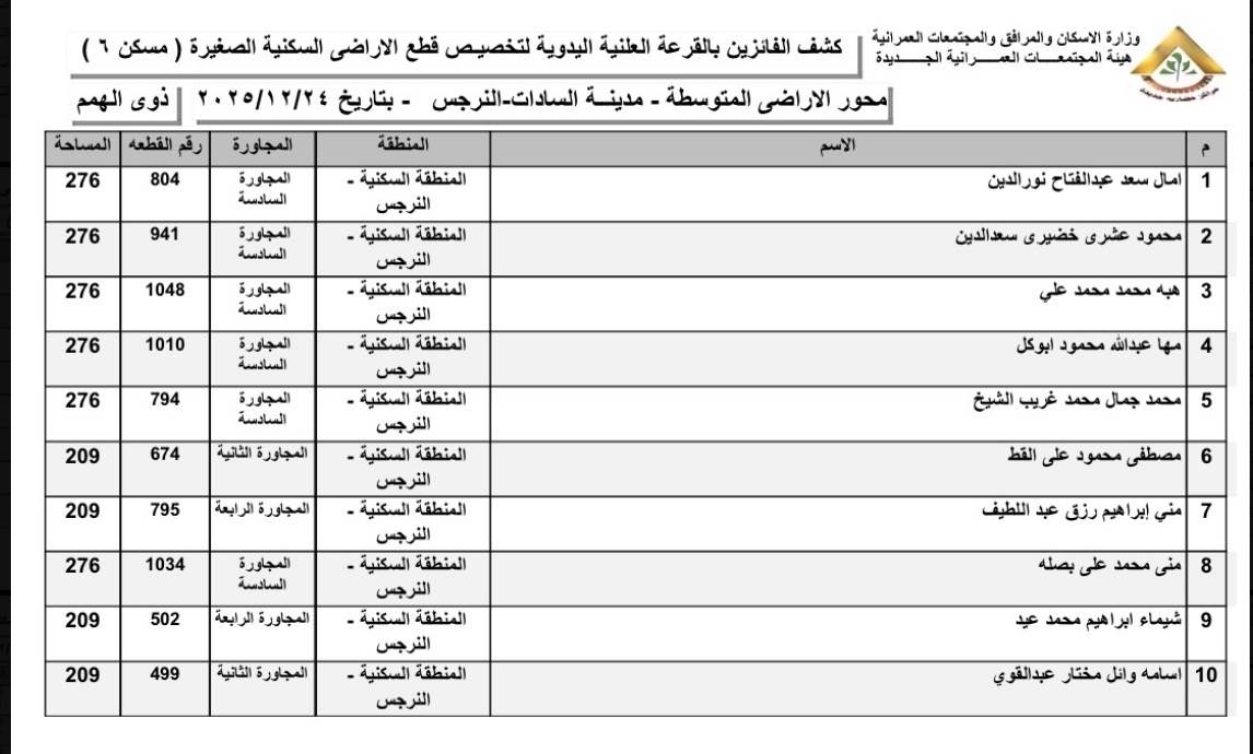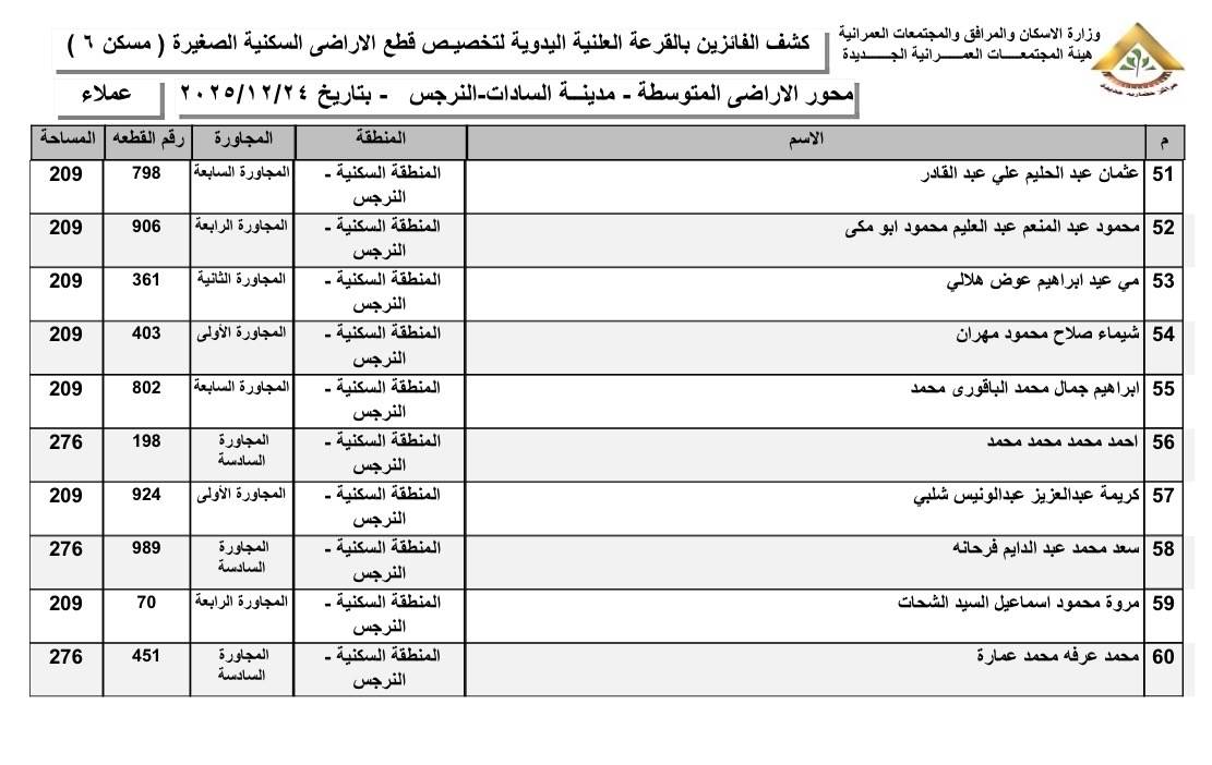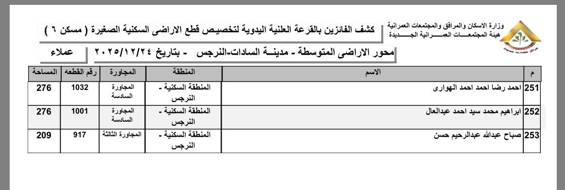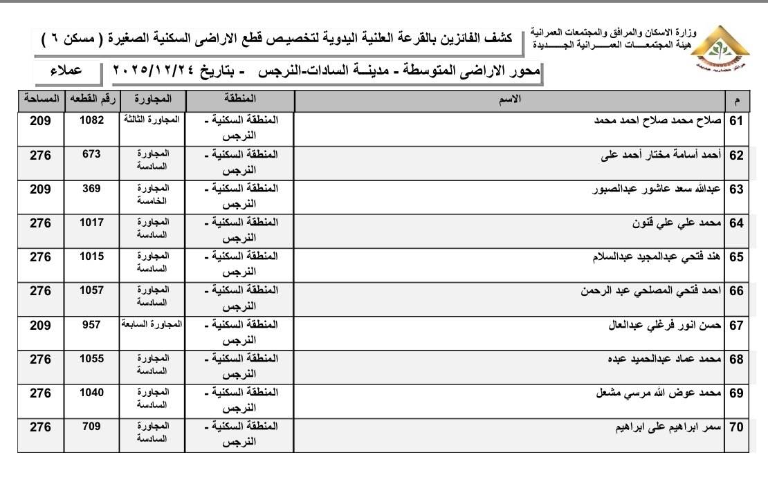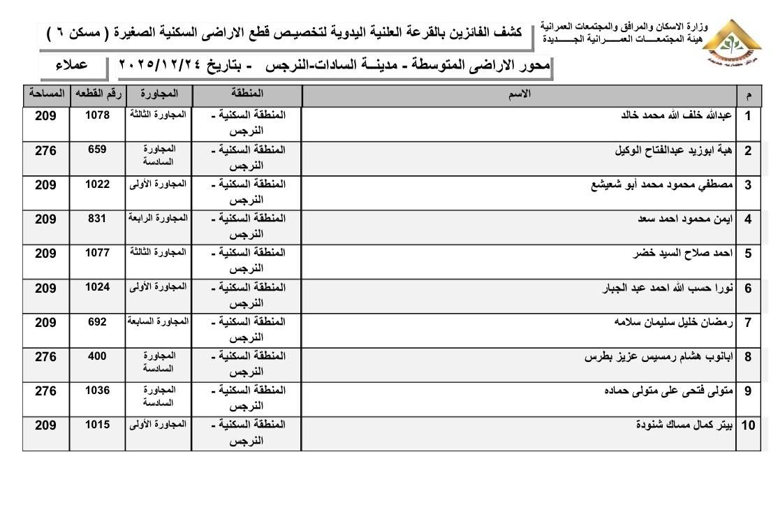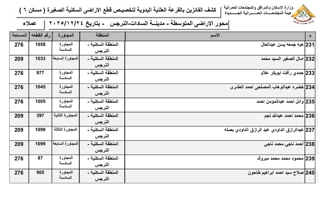 الفائزون بأراضي مسكن الطرح السادس بمدينة السادات بمنطقة النرجس