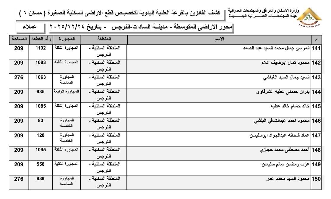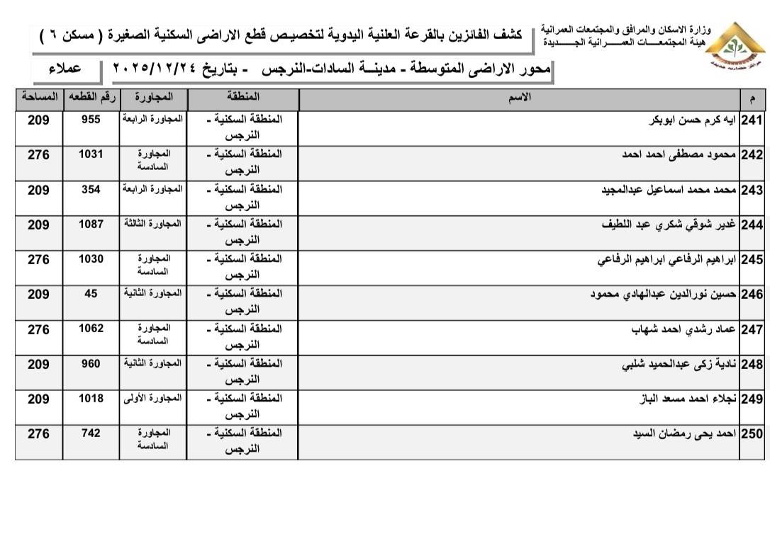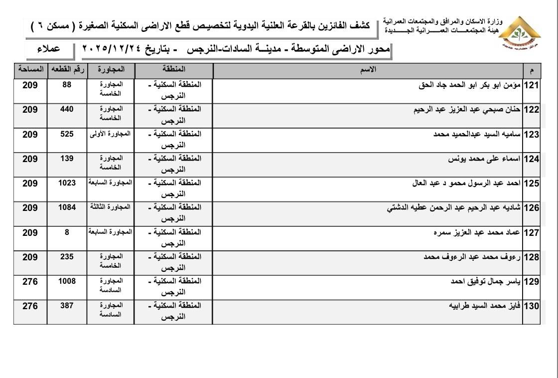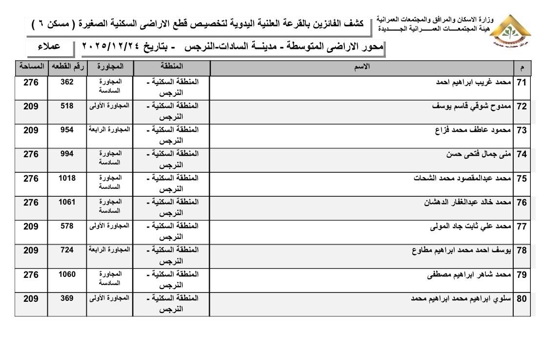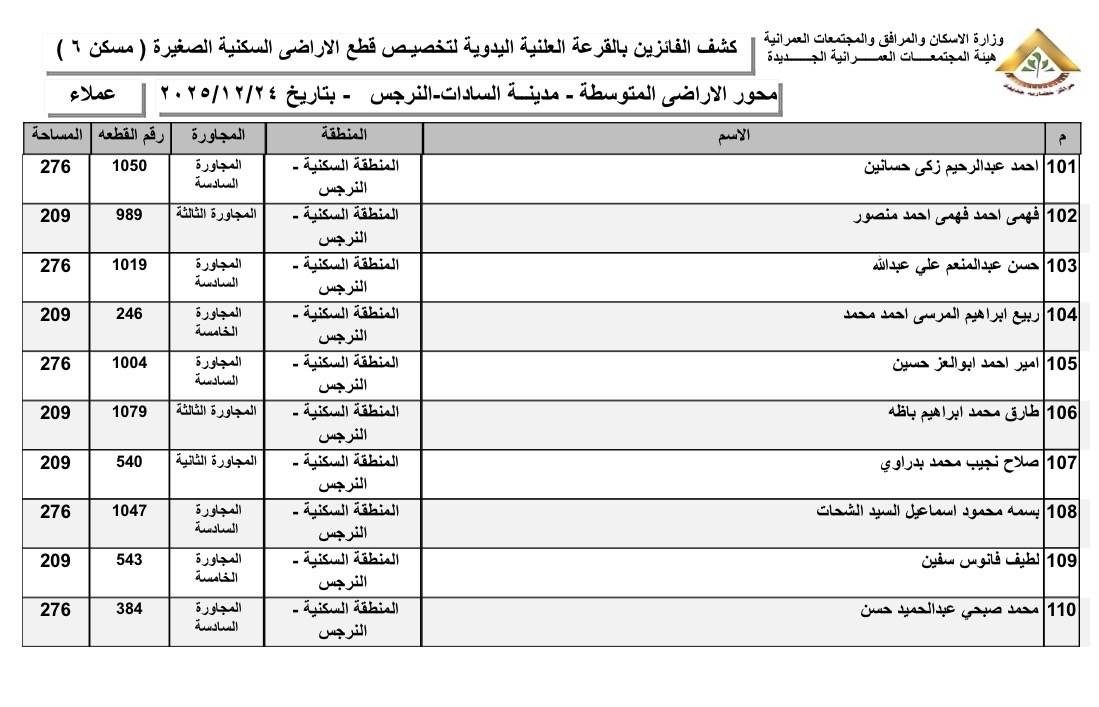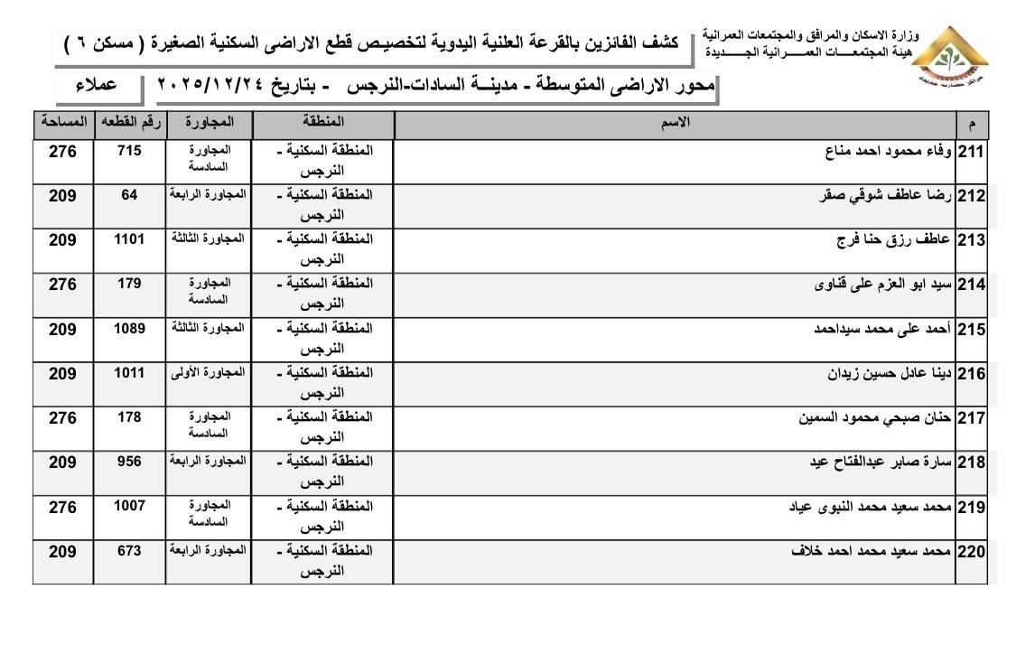 الفائزون بأراضي مسكن الطرح السادس بمدينة السادات بمنطقة النرجس