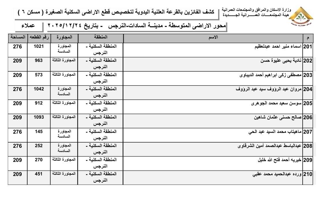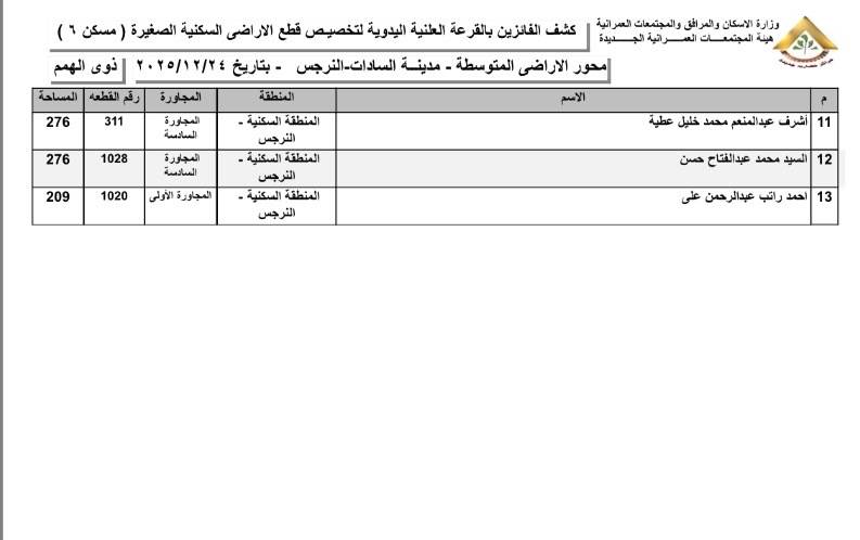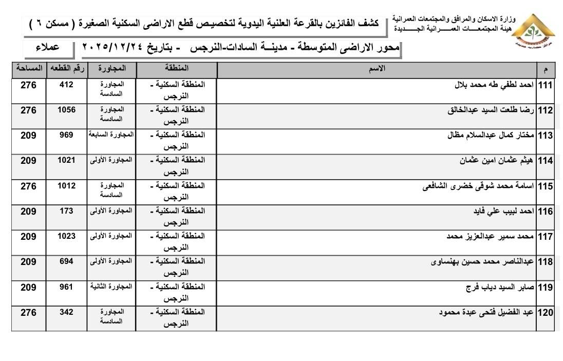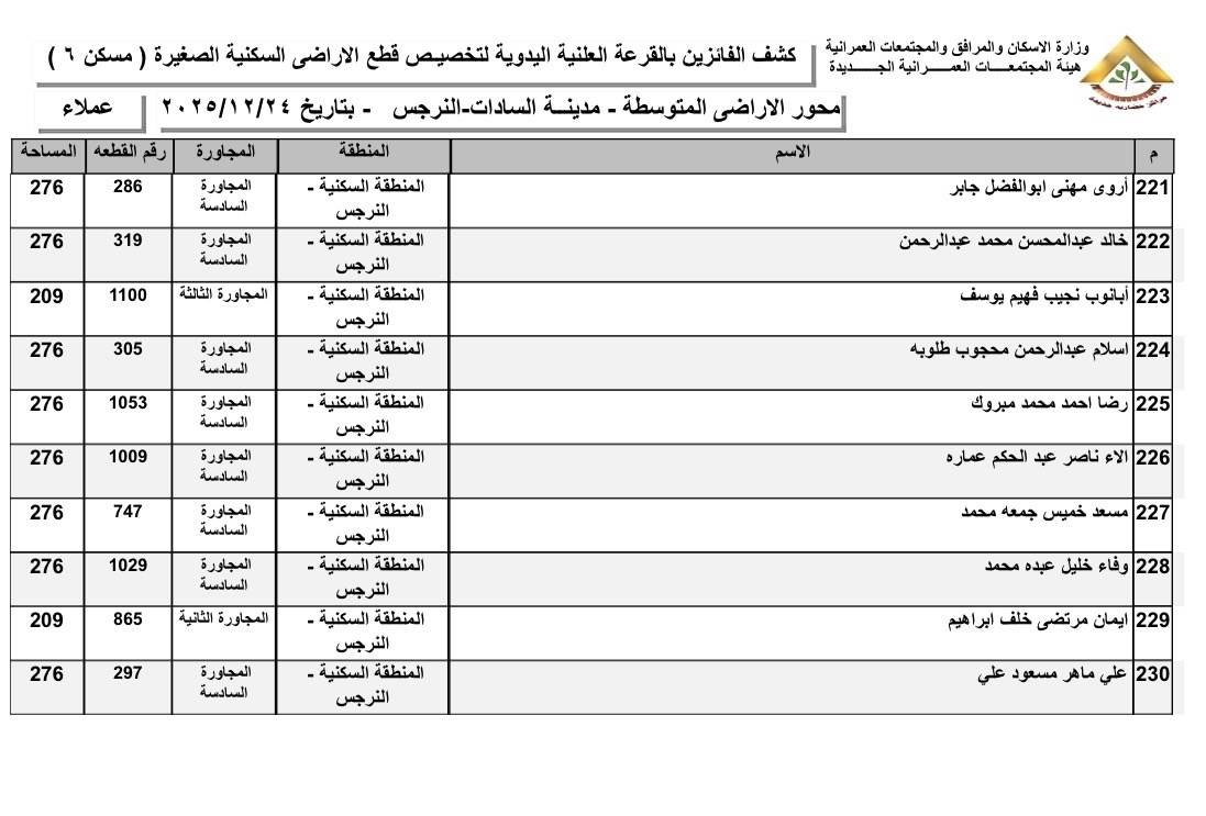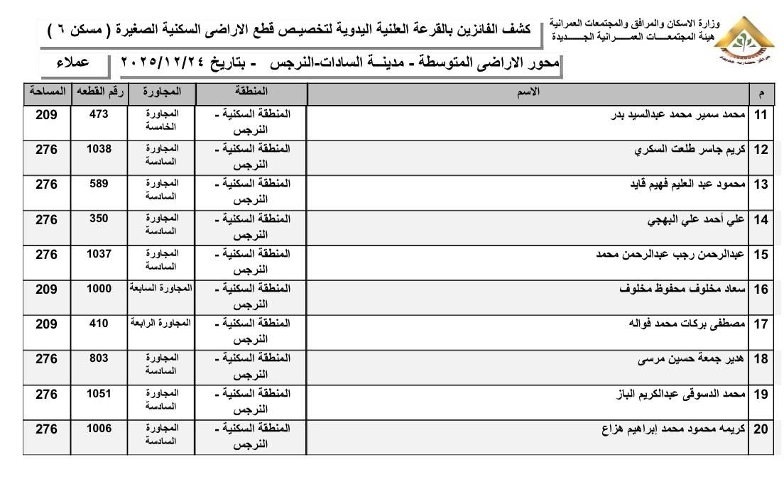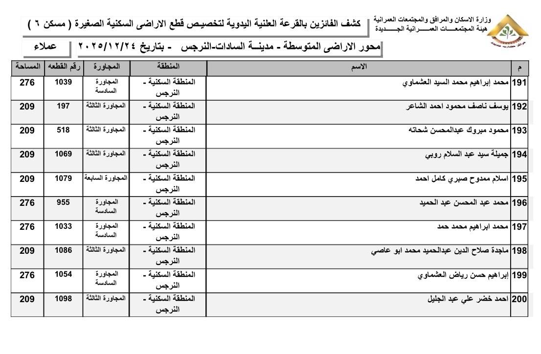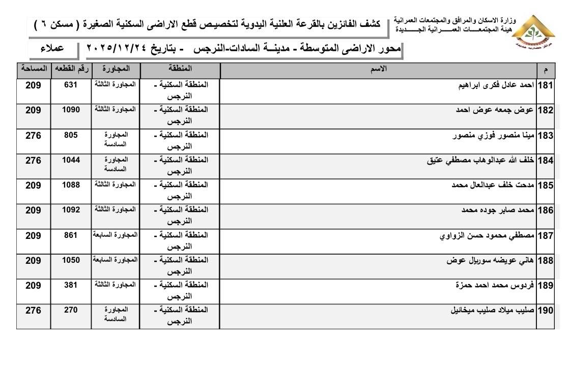 الفائزون بأراضي مسكن الطرح السادس بمدينة السادات بمنطقة النرجس