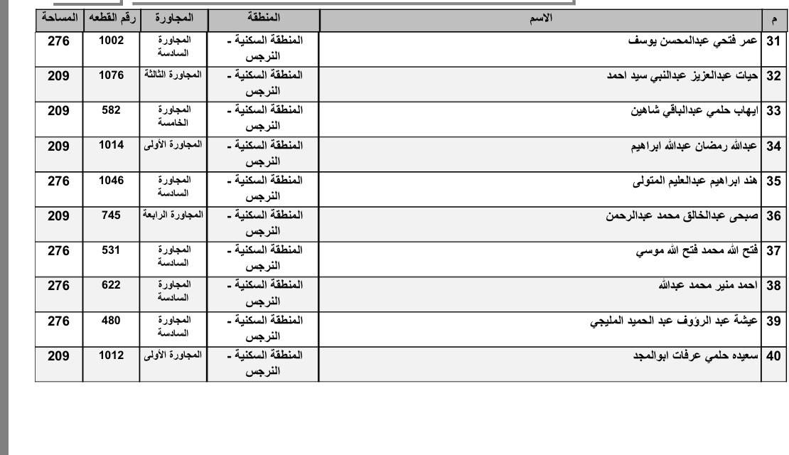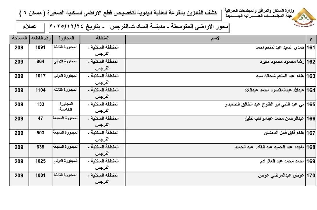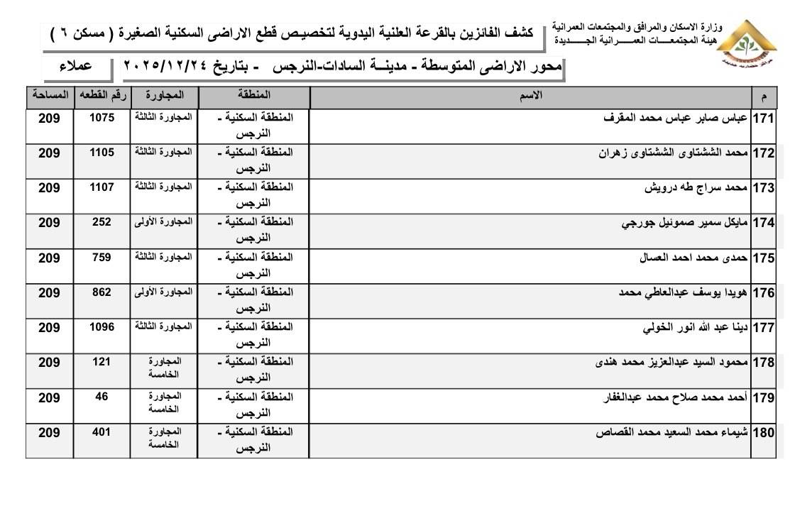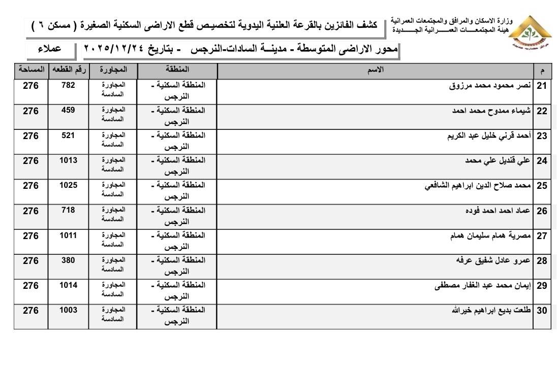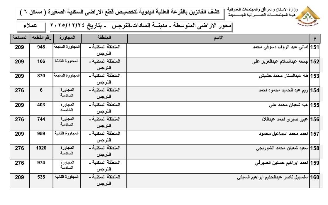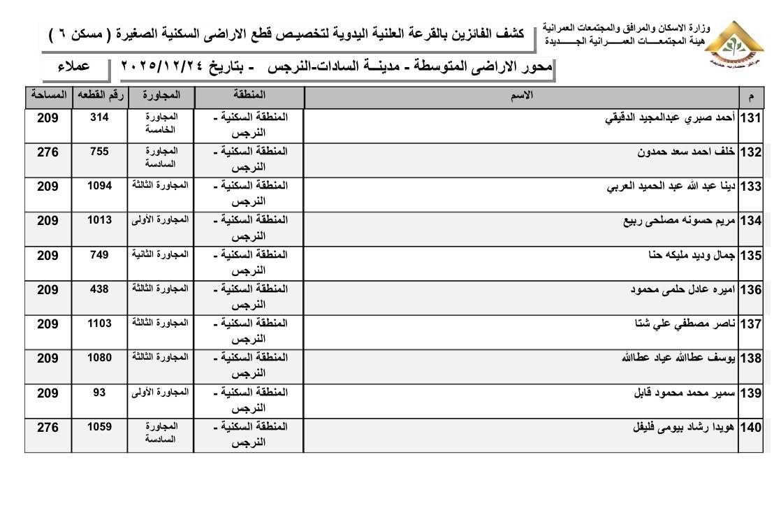 الفائزون بأراضي مسكن الطرح السادس بمدينة السادات بمنطقة النرجس