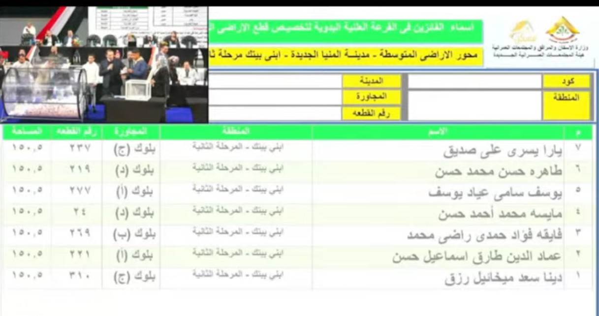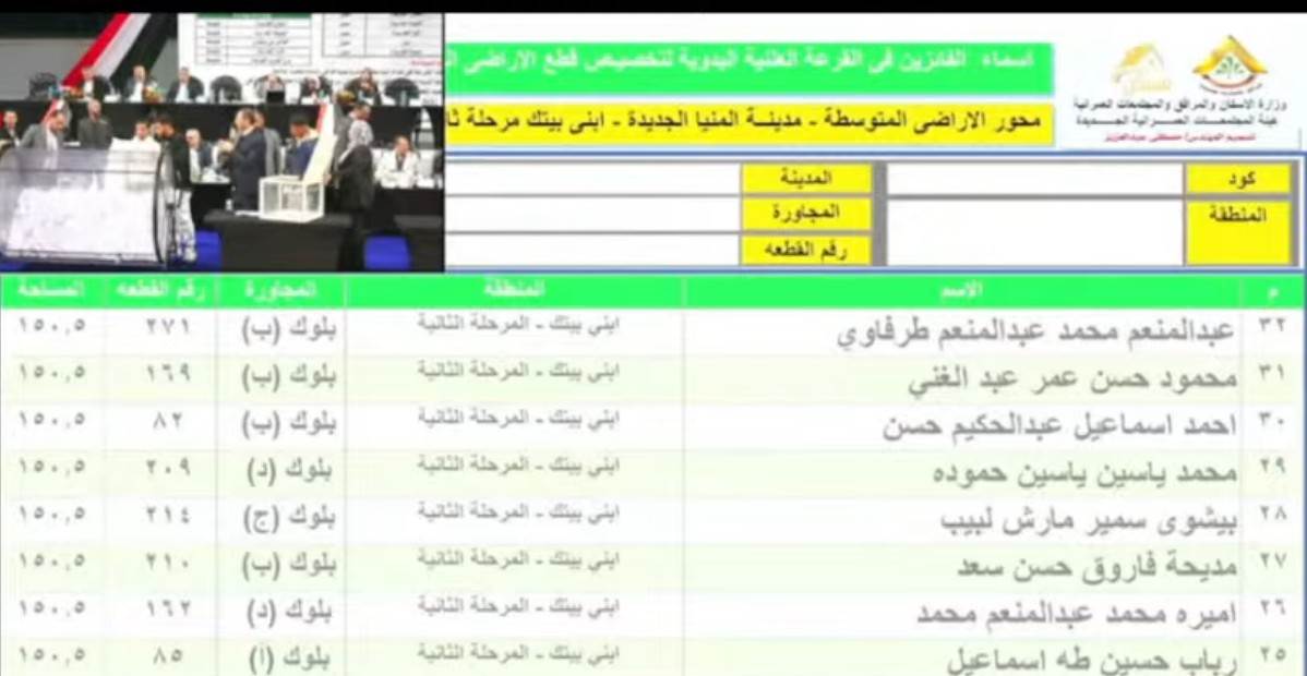 وينشر المؤشر أسماء الفائزين في القرعة اليدوية لليوم الثاني لقطع الأراضي المتوسطة بمدينة المنيا الجديدة: