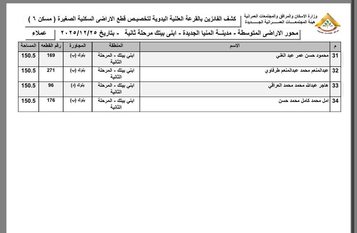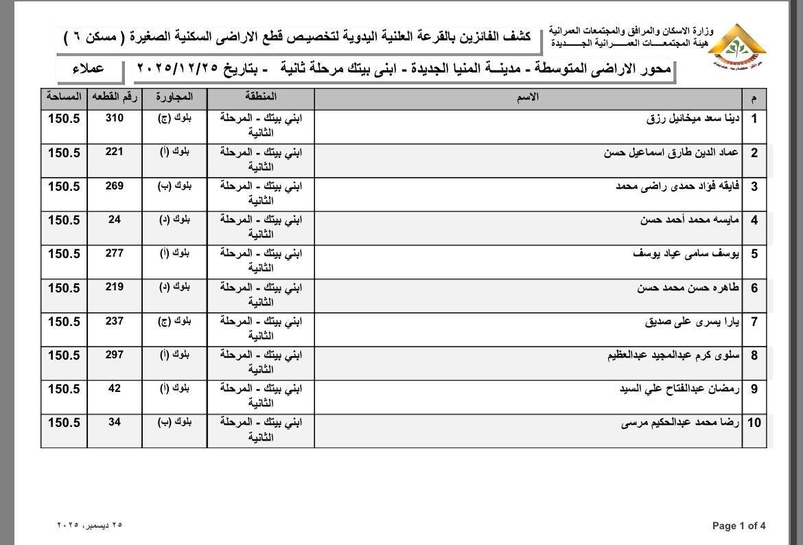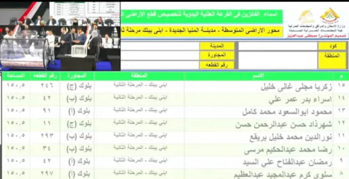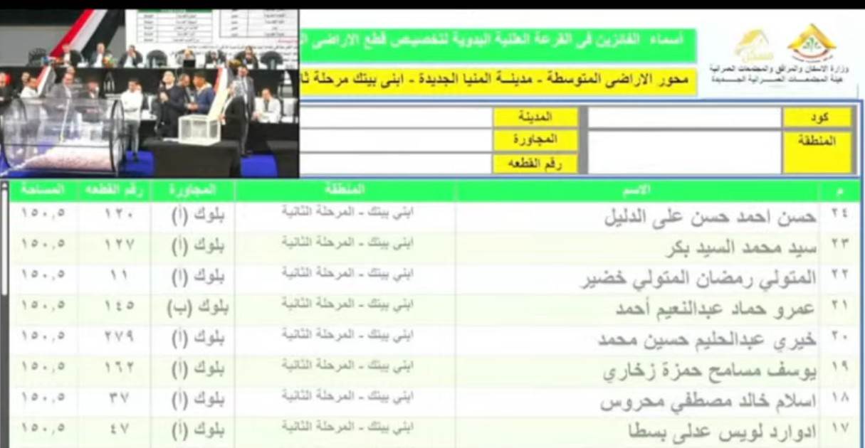 أسماء الفائزين بقطع الأراضي المتوسطة بمدينة المنيا الجديدة