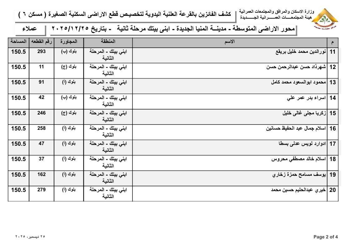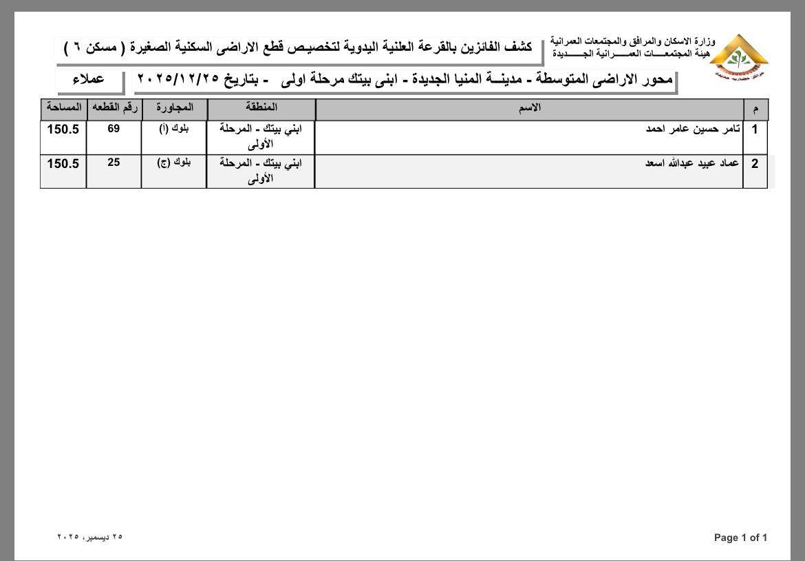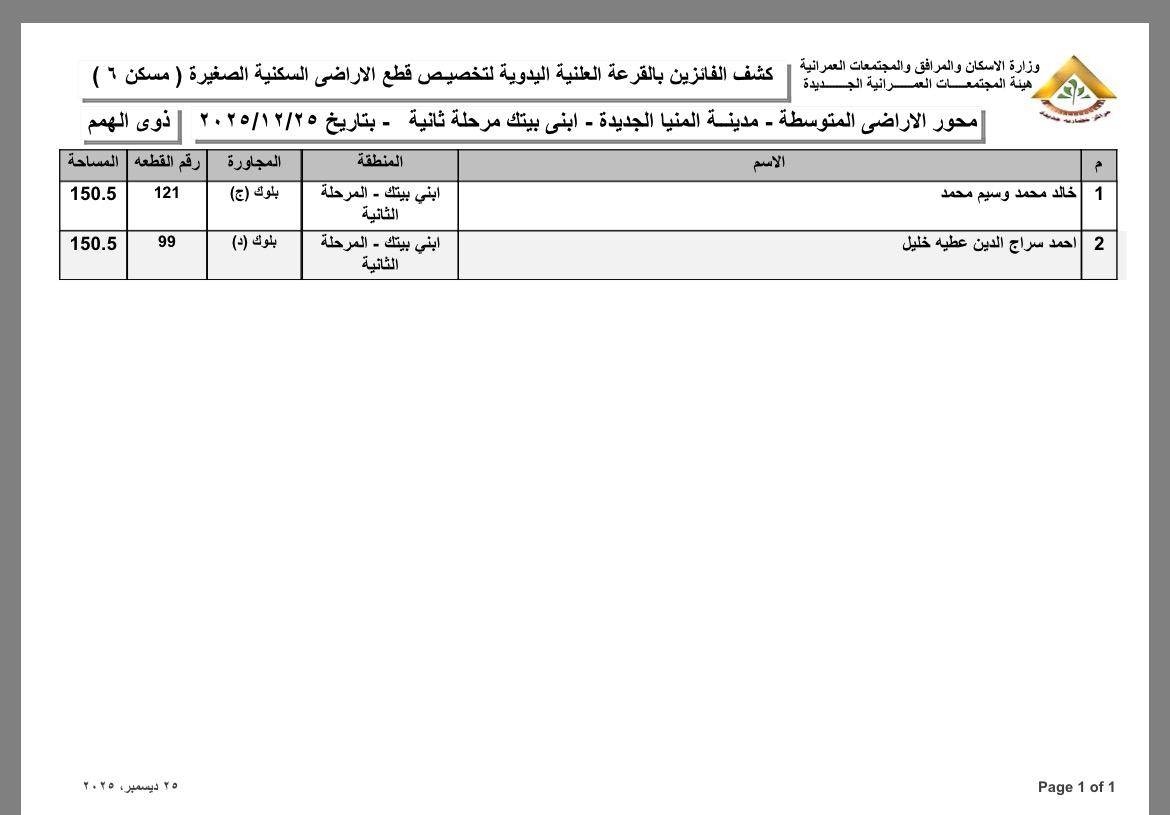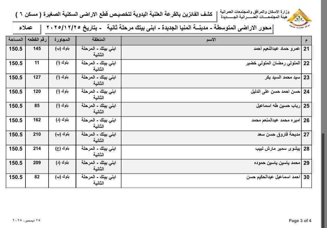 أسماء الفائزين بقطع الأراضي المتوسطة بمدينة المنيا الجديدة