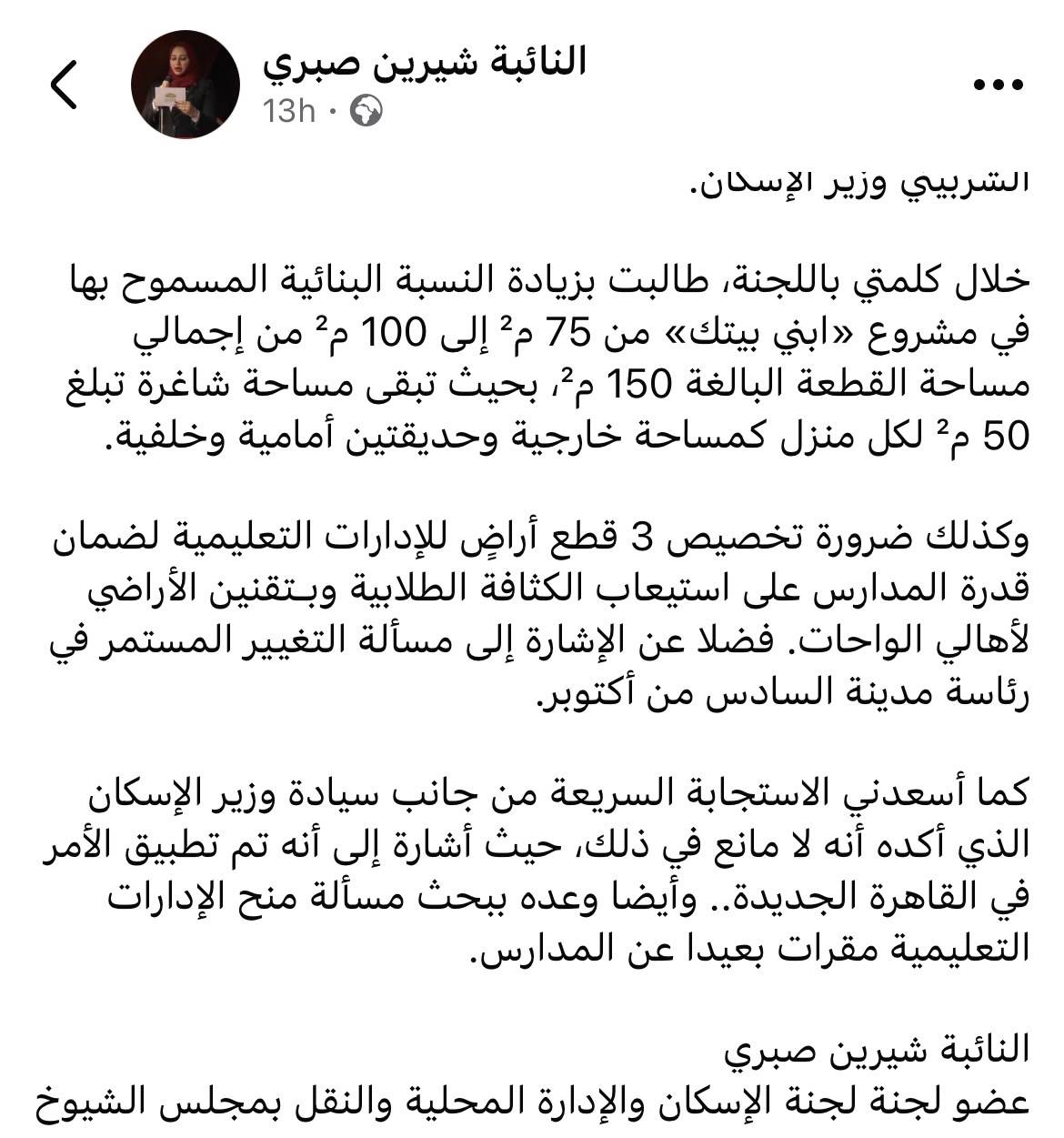 جاء ذلك خلال اجتماع لجنة الإسكان والإدارة المحلية والنقل بمجلس الشيوخ، بحضور وزير الإسكان، وذلك عقب مطالب تقدمت بها النائبة شيرين صبري، عضو اللجنة، بشأن تعديل الاشتراطات البنائية بالمشروع بما يحقق توازنًا بين الكثافة السكنية وجودة المعيشة.