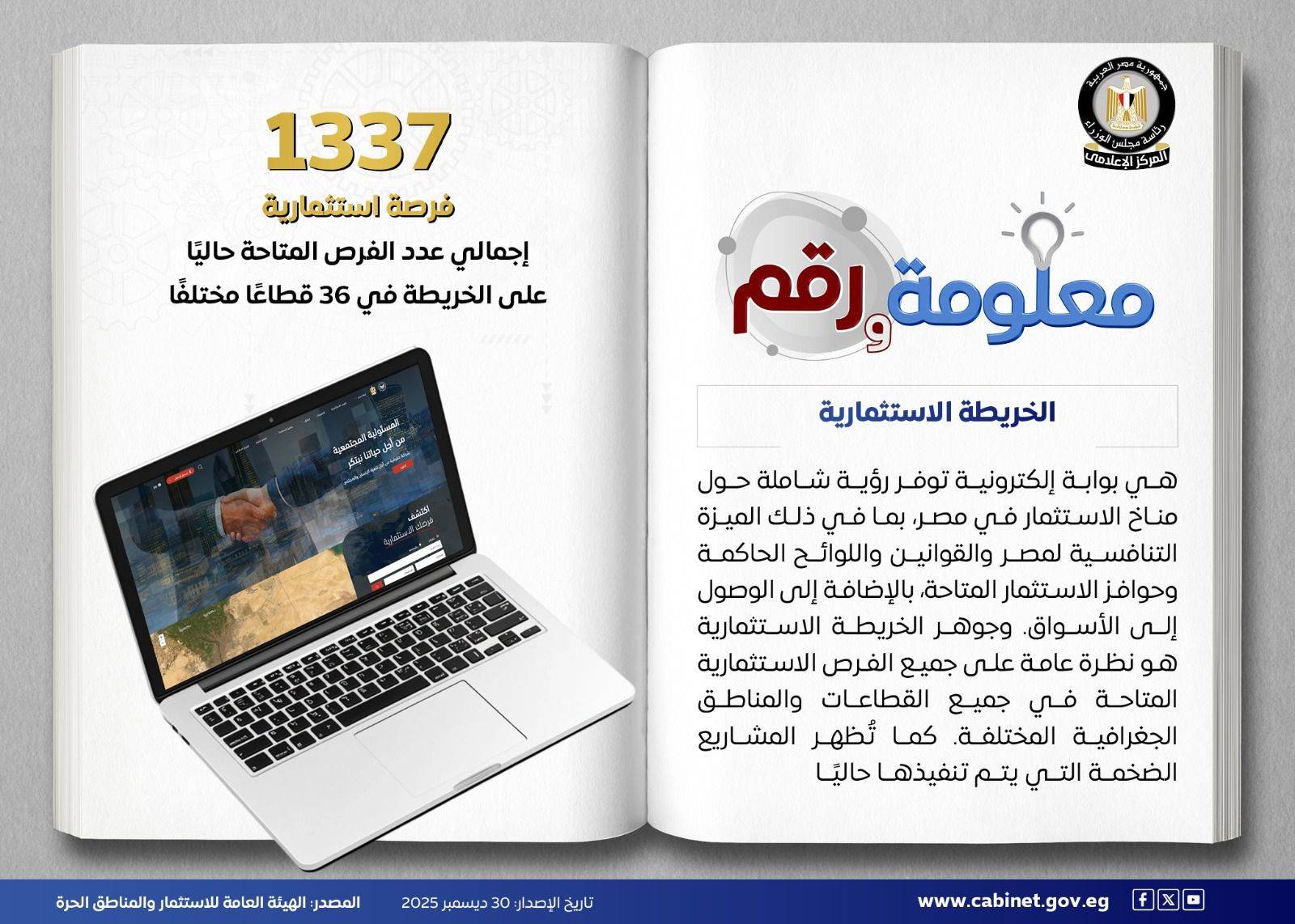 وأضاف البيان: تعرض الخريطة 1337 فرصة استثمارية في 36 قطاعًا متنوعًا، وتشمل أهم المشاريع الكبرى الجاري تنفيذها حاليًا، كما توفر معلومات عن الميزة التنافسية لمصر والقوانين واللوائح وحوافز الاستثمار، إلى جانب تسهيل الوصول للأسواق المختلفة، لتصبح أداة استراتيجية تدعم المستثمرين في التخطيط واتخاذ القرارات الاستثمارية بشكل واضح ومدروس.