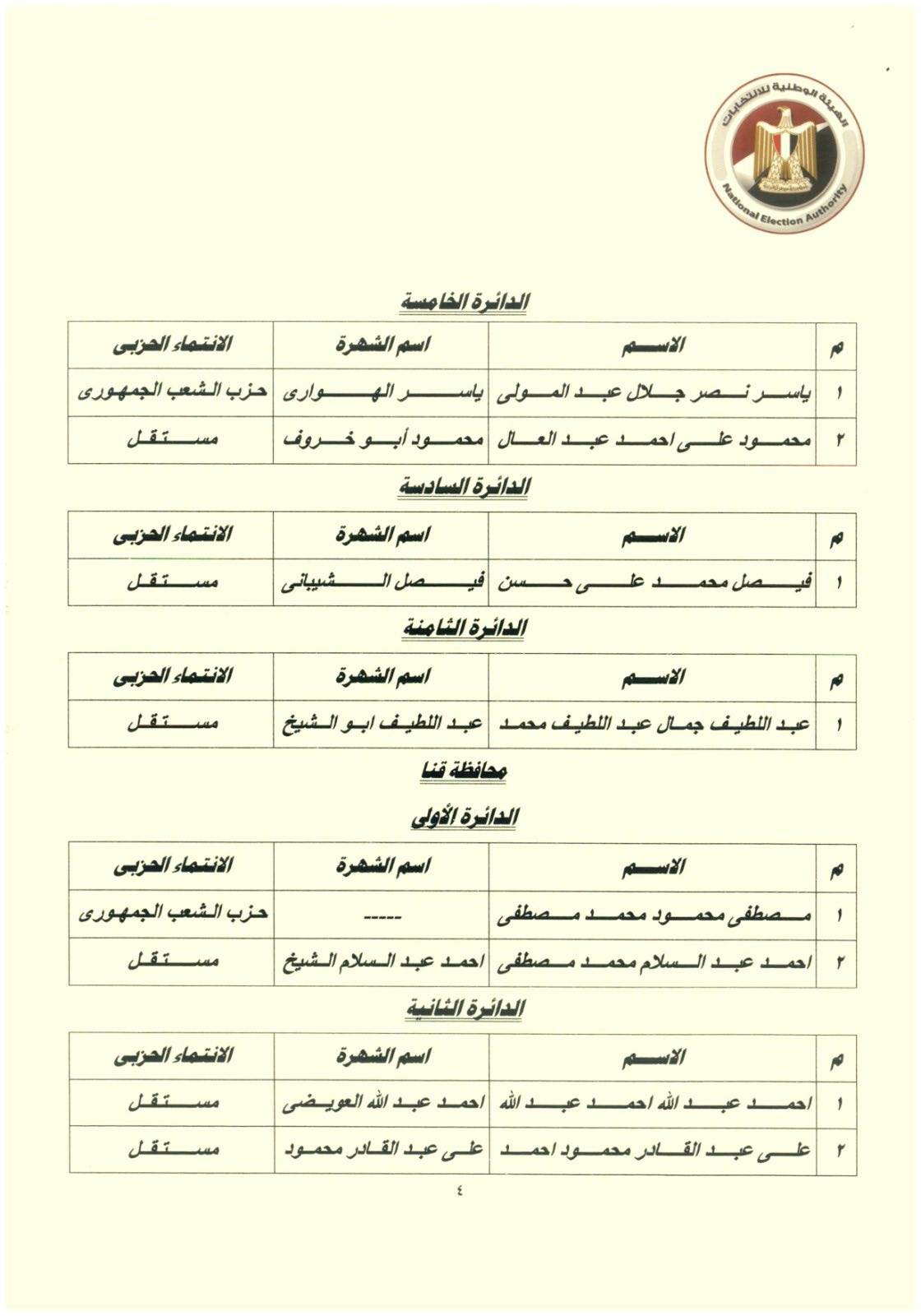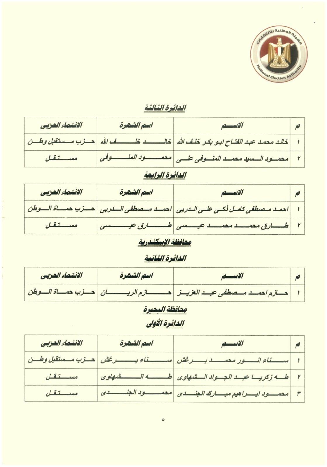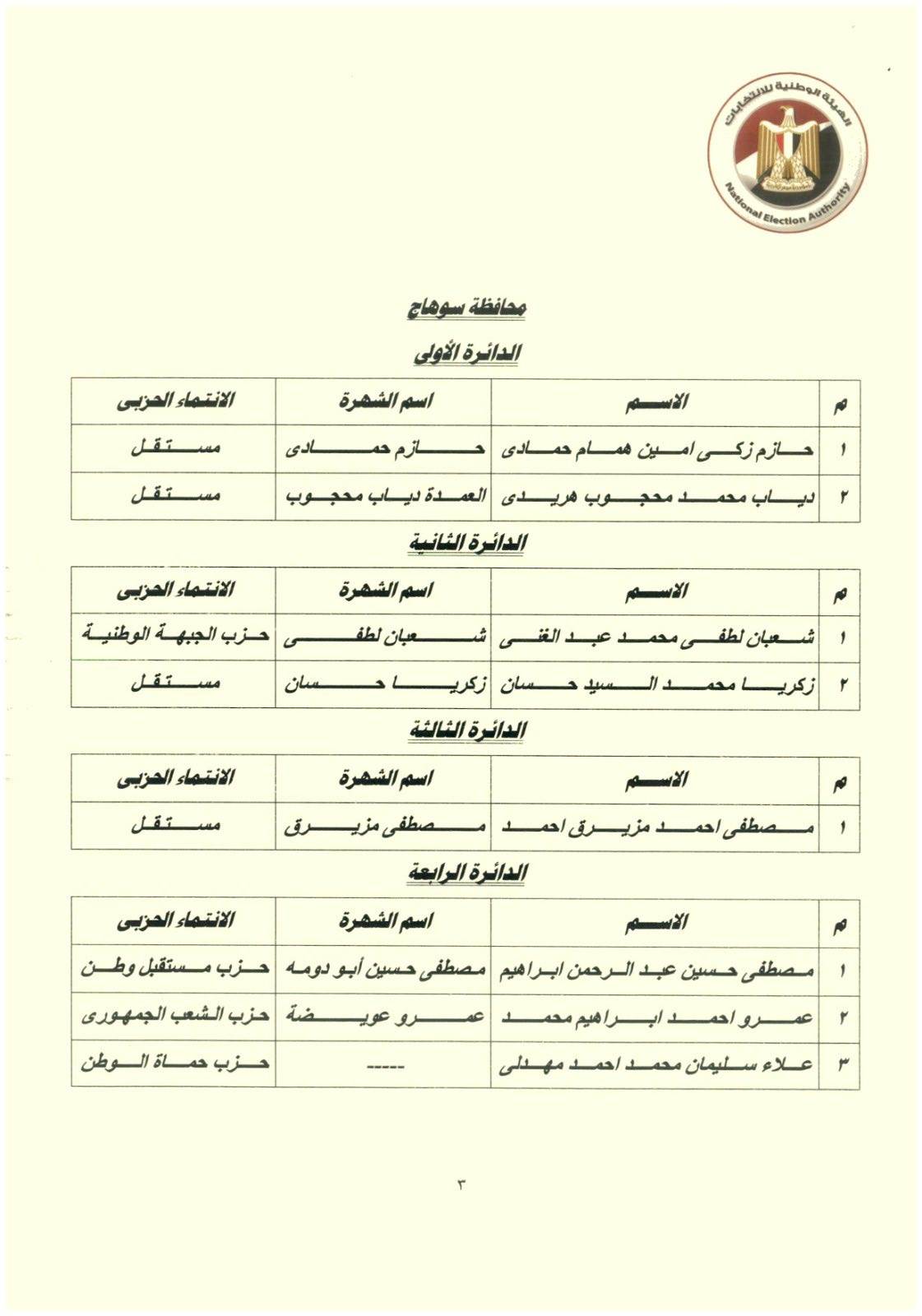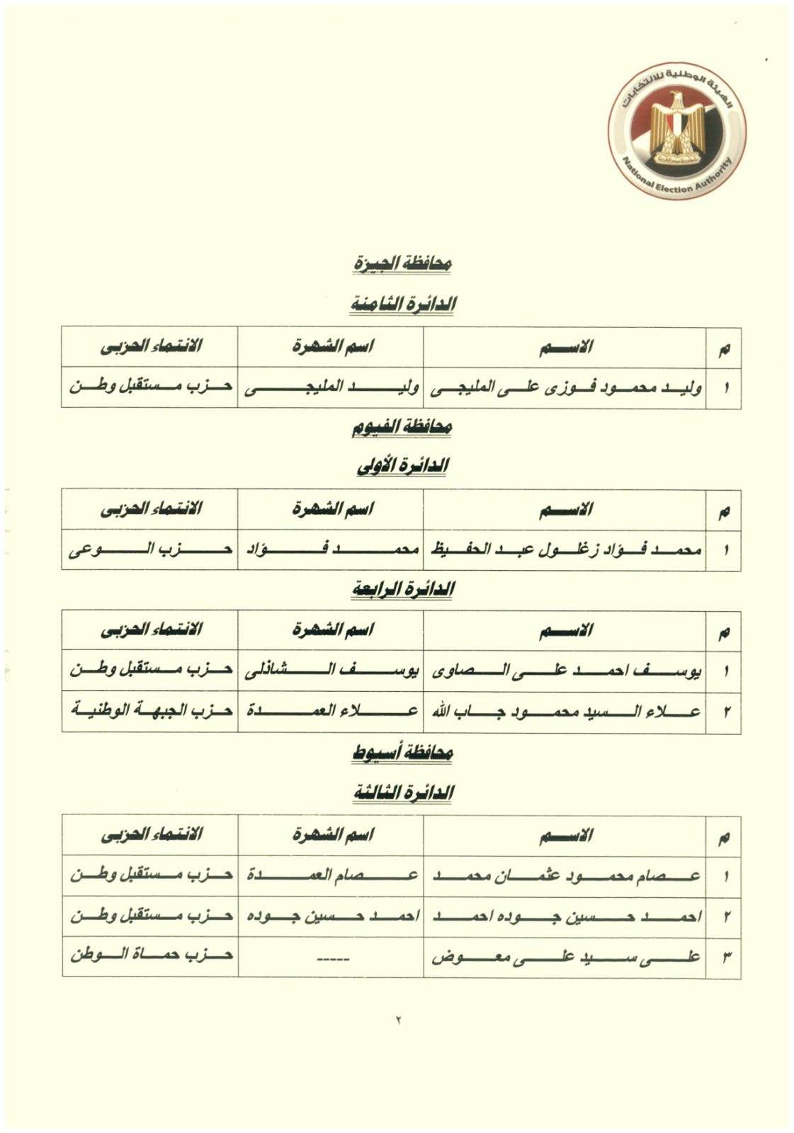 واعتمدت الهيئة الوطنية للانتخابات النتائج الرسمية لجولة الإعادة، والتي أسفرت عن فوز مرشح بالدائرة الثامنة بمحافظة الجيزة، وحسم 3 مقاعد بالدائرتين الأولى والرابعة بمحافظة الفيوم، و3 مقاعد بمحافظة أسيوط، و12 مقعدًا بمحافظة سوهاج، و8 مقاعد بمحافظة قنا، ومقعد بالدائرة الثانية بمحافظة الإسكندرية، إلى جانب حسم 7 مقاعد بمحافظة البحيرة.