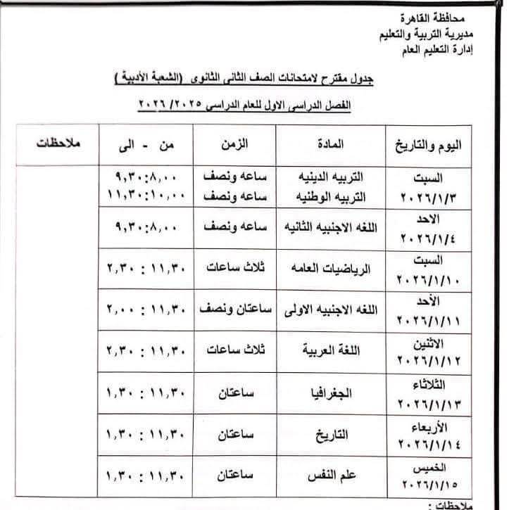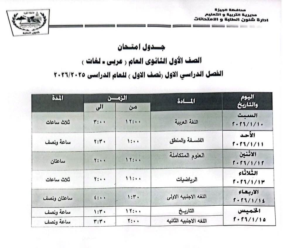 تنطلق امتحانات الصف الثاني الثانوي من السبت 10 يناير وحتى الخميس 15 يناير، وفق الجدول التالي لمحافظة الجيزة: