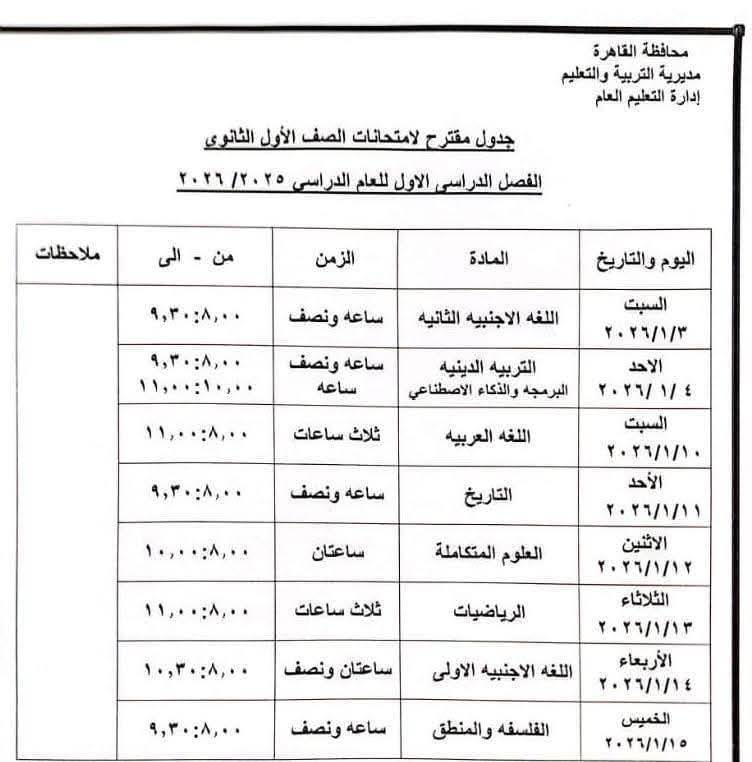 تستمر امتحانات الصف الأول الثانوي لمدة 6 أيام متتالية من السبت 10 يناير وحتى الخميس 15 يناير، وفق المواد التالية في محافظة الجيزة للمدارس الحكومية والخاصة: