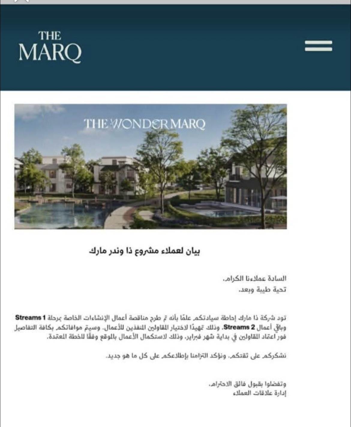 أبدى عدد كبير من الملاك استيائهم من بيان ذا مارك، خاصة أن مرحلة Streams 1 كان من المقرر تسليمها في مايو 2026، في الوقت الذي يؤكد فيه ملاك أن أرض المشروع ما زالت دون تنفيذ فعلي، ولم تشهد أعمال إنشاءات حقيقية حتى الآن.