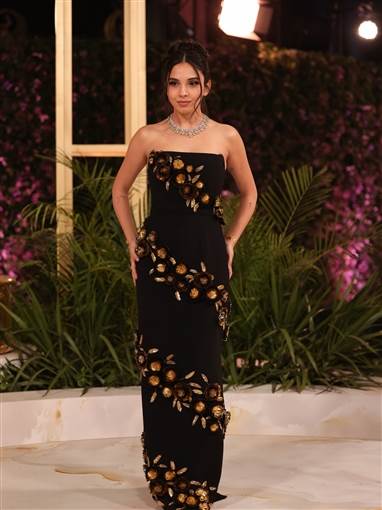 تألقت سلمى بفستان أسود طويل وضيق مكشوف الكتفين، مزين بورود ذهبية بارزة، من تصميم Carolina Herrera، بسعر وصل إلى 537 ألف جنيه مصري.