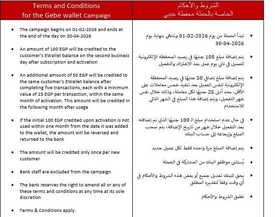 وقال البنك عبر صفحته الرسمية على مواقع التواصل الاجتماعي فيسبوك: دلوقتي مع EBank هتكسب لحد 150 جم رصيد (صالح لمدة شهر) لما تفعل وتستخدم محفظة جيبي الالكترونية.