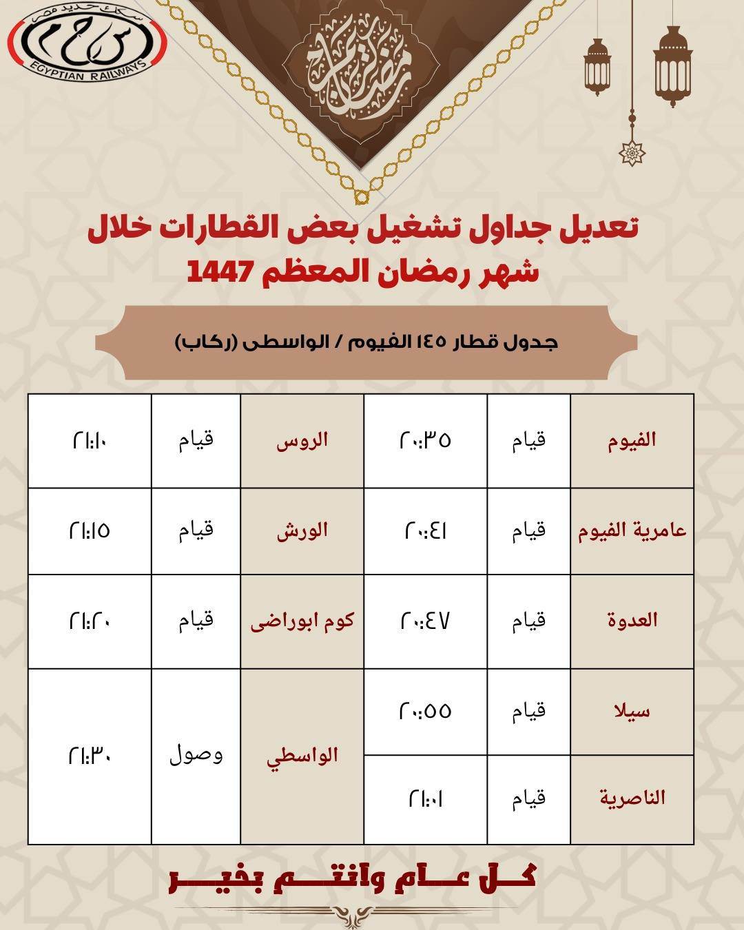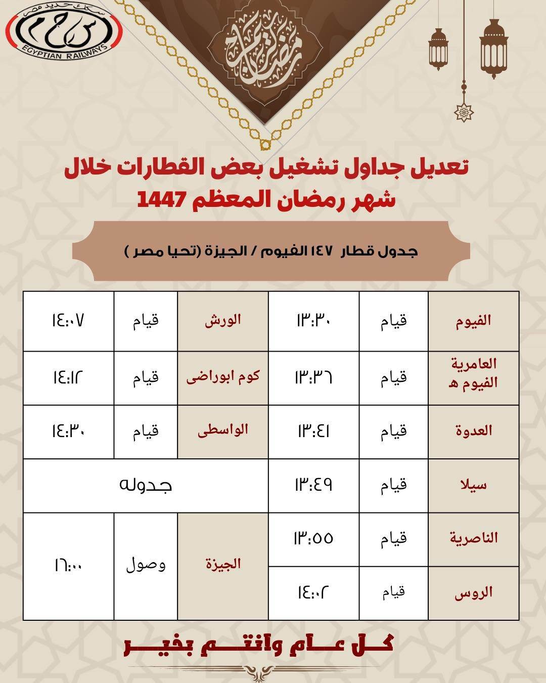 في إطار حرص الهيئة القومية لسكك حديد مصر التيسير على جمهور الركاب خلال شهر رمضان المبارك، تقرر تعديل مواعيد بعض القطارات على عدد من خطوط الشبكة بما يتماشى مع طبيعة التشغيل وخدمة جمهور الركاب خلال الشهر الكريم، وذلك اعتبارًا من يوم الاربعاء الموافق 18 فبراير 2026، ومع بدء شهر رمضان المعظم كالتالى :