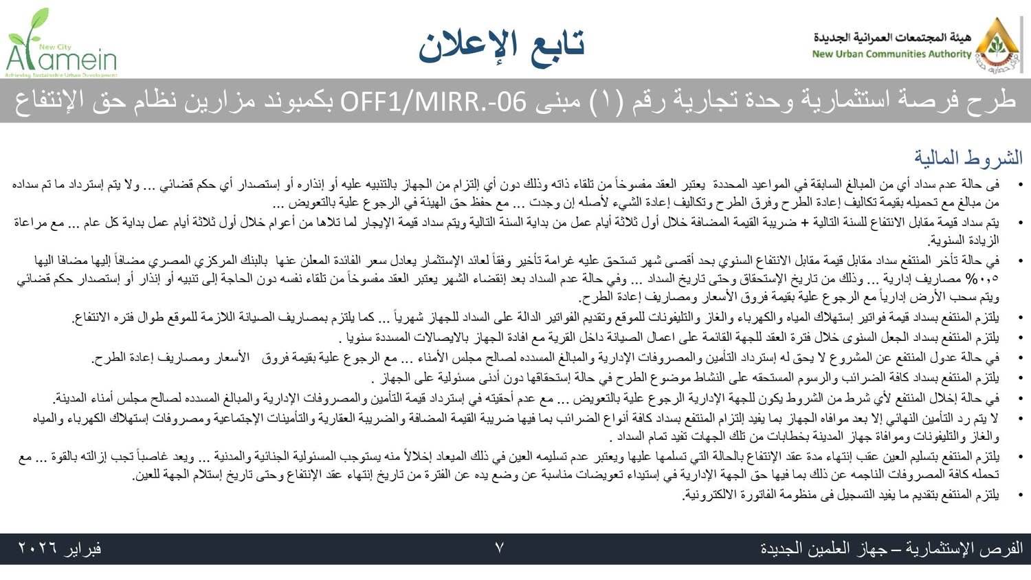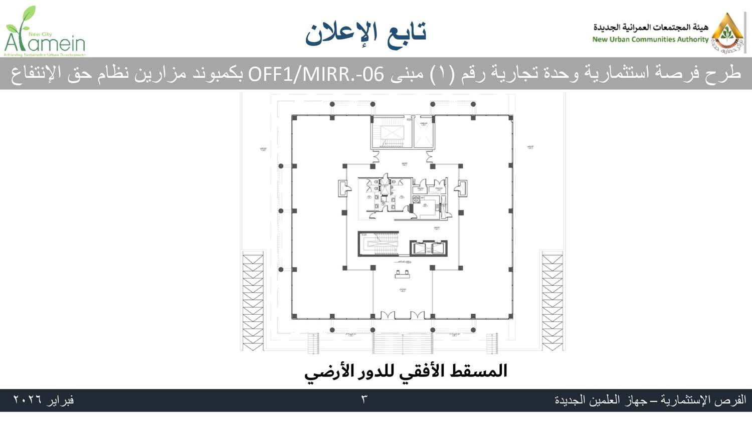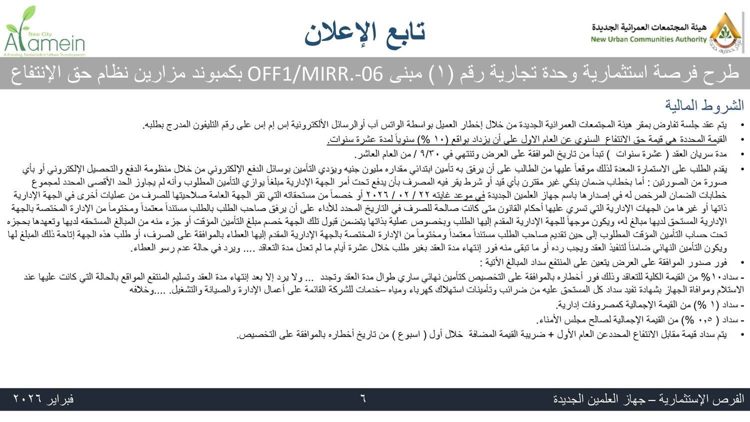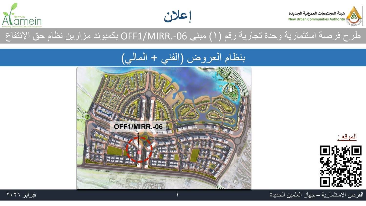 اضاف رئيس جهاز العلمين الجديدة، ان طرح الفرصة تتمثل في وحدة تجاريه بنشاط رقم (1) مبني 6_OFF1/MIRR داخل كمبوند مزارين، ويتم التخصيص وفق نظام حق الانتفاع، لضمان أعلى جودة تشغيل وتحقيق أفضل استفادة من الموقع المتميز.