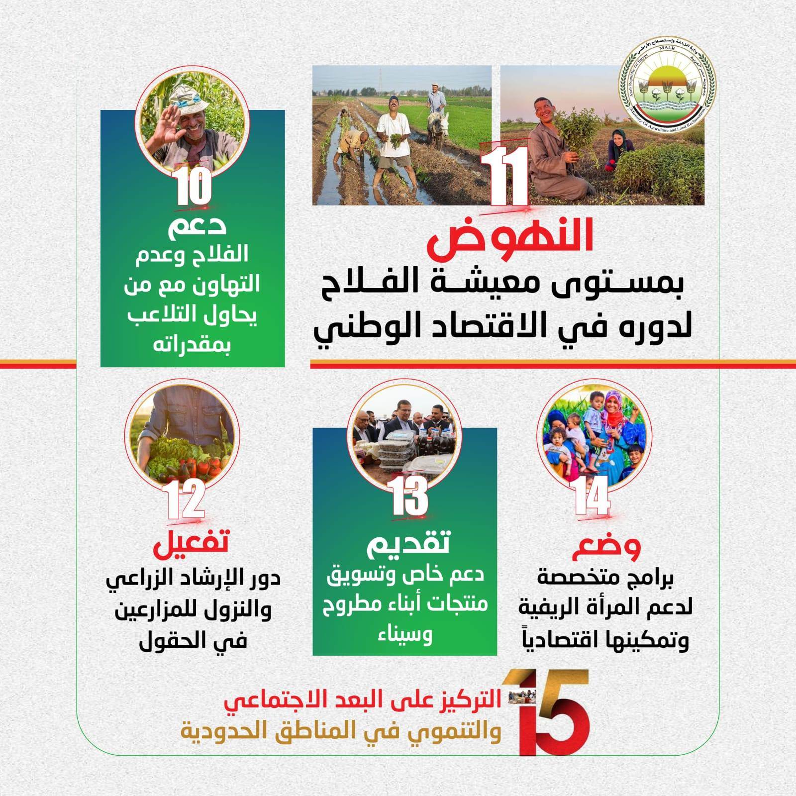 وأكد على ضرورة أن تشمل خطط العمل خلال الفترة المقبلة: تفعيل دور الإرشاد الزراعي والنزول للمزارعين في الحقول، فضلا عن تطوير منظومة الزراعة الآلية وتقديم الخدمات بأسعار مناسبة، إضافة الى التوسع في إقامة منافذ بيع المنتجات والسلع الغذائية بأسعار مخفضة لتقليل الحلقات الوسيطة وتخفيف العبء عن المواطنين، إضافة إلى تكثيف الجهود في ملف إزالة التعديات على الأراضي الزراعية باعتبارها خطاً أحمر.