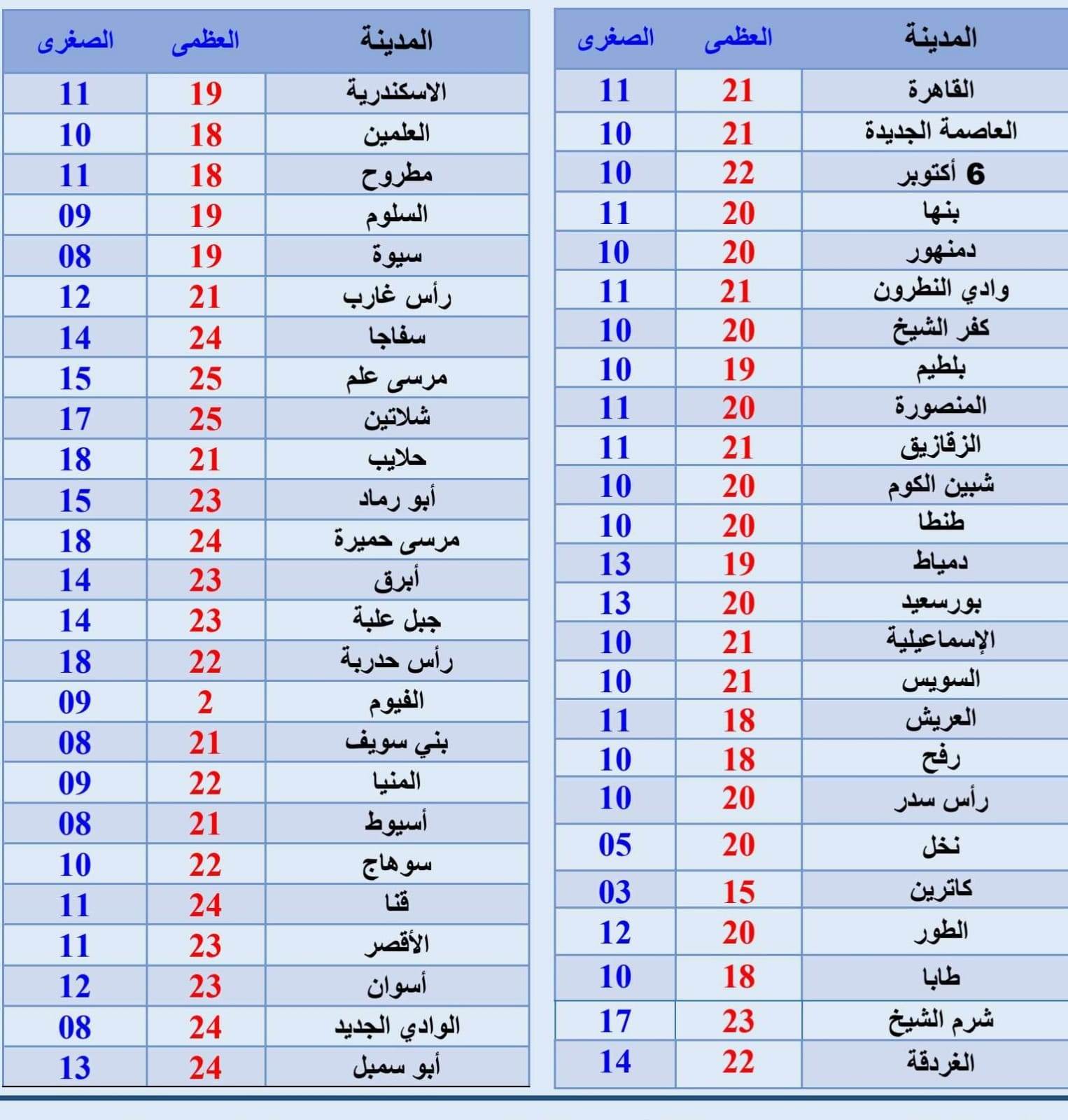 أما مدن سيناء فتسجل السويس 21 للعظمى، و10 الصغرى، والعريش 18 و11، ورفح 18 و10، ورأس سدر 20 و10، مع طقس لطيف نهارًا بارد ليلًا.