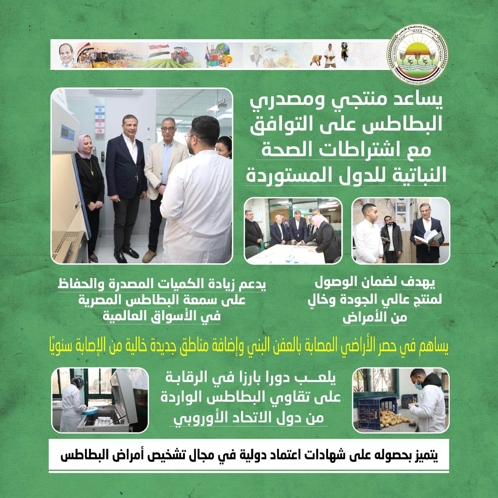 وتفقد وزير الزراعة ومحافظ الجيزة، وبعض قيادات الوزارة، أروقة المعمل، والأقسام التابعة له، حيث يضم 20 معملا متخصصًا ووحدة، تستهدف دعم منتجي ومصدري البطاطس على التوافق مع اشتراطات الصحة النباتية للدول المستوردة.