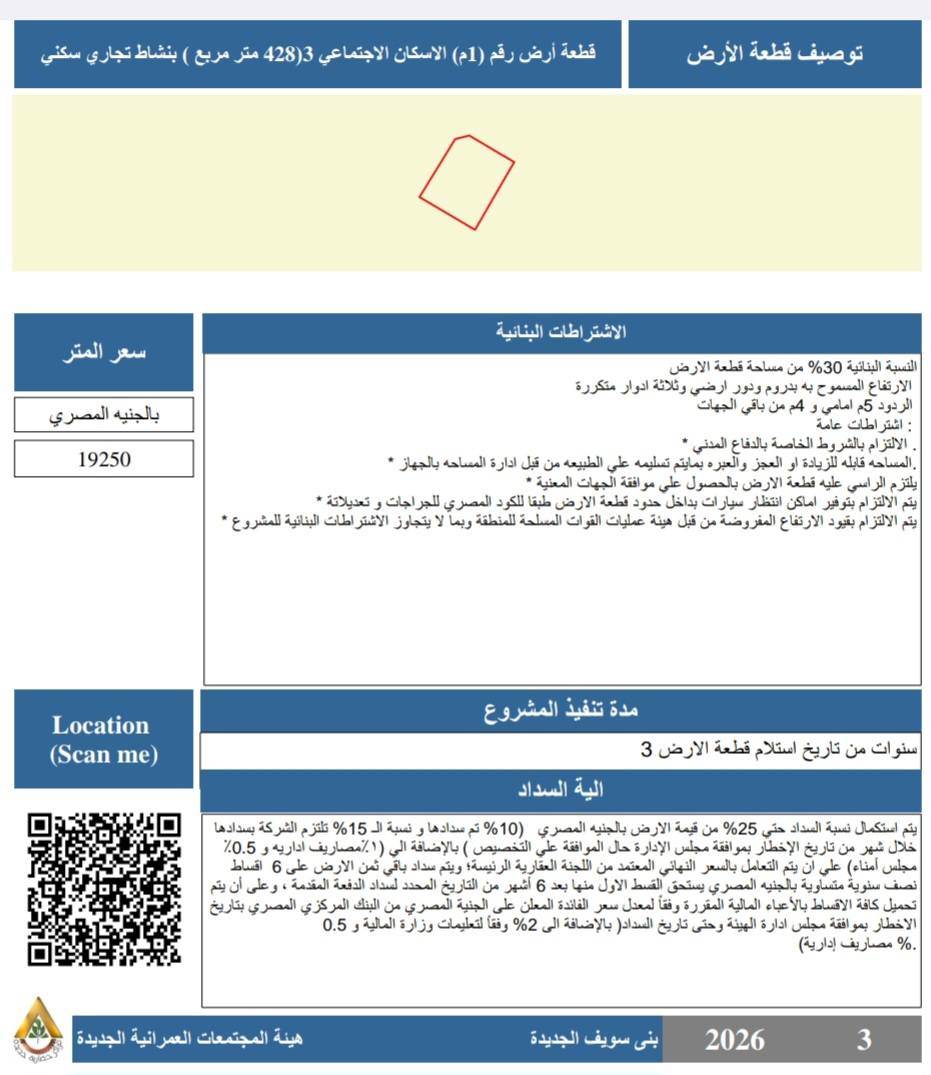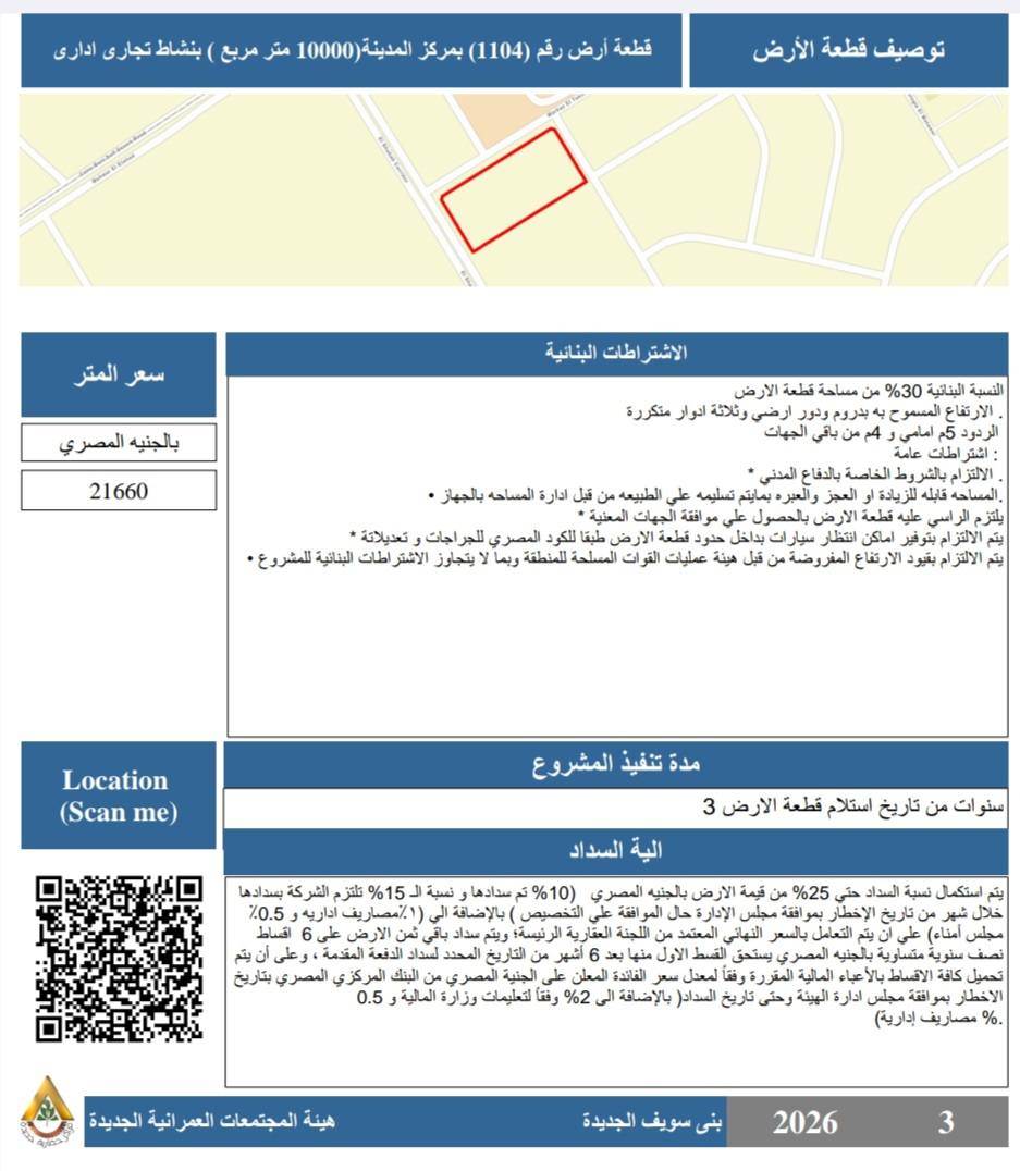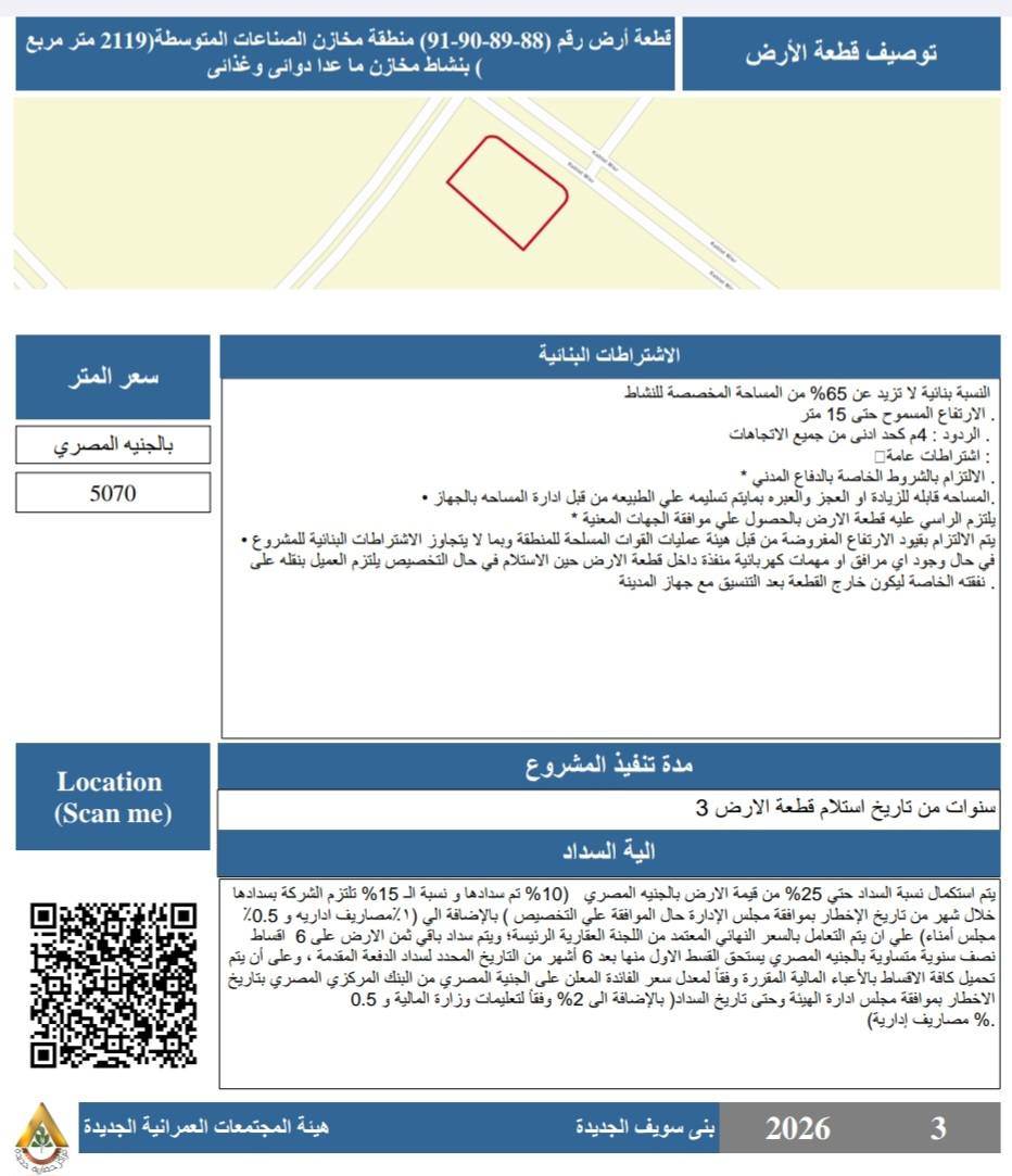 في إطار توجيهات المهندسة رانده المنشاوي، وزيرة الإسكان والمرافق والمجتمعات العمرانية، بتكثيف طرح الأراضى الاستثمارية بالمدن الجديدة، واستكمالاً للجهود المبذولة لدفع عجلة التنمية بمدينة بنى سويف الجديدة تحت قيادة المهندس أحمد عبدالجابر عبداللاه، يعلن جهاز المدينة عن طرح فرص استثمارية لشهر مارس 2026 للتخصيص الفوري.