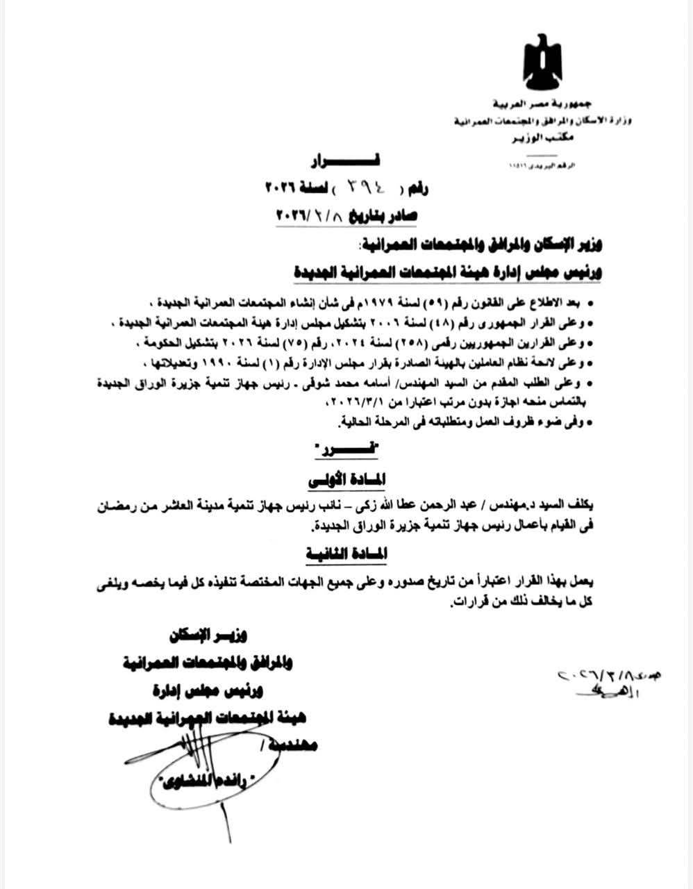يأتي ذلك بعد أن تقدم المهندس أسامه محمد شوقي - رئيس جهاز تنمية جزيرة الوراق الجديدة بالتماس لمنحه إجازة بدون مرتب اعتبارا من ٢٠٢٦/٣/١.