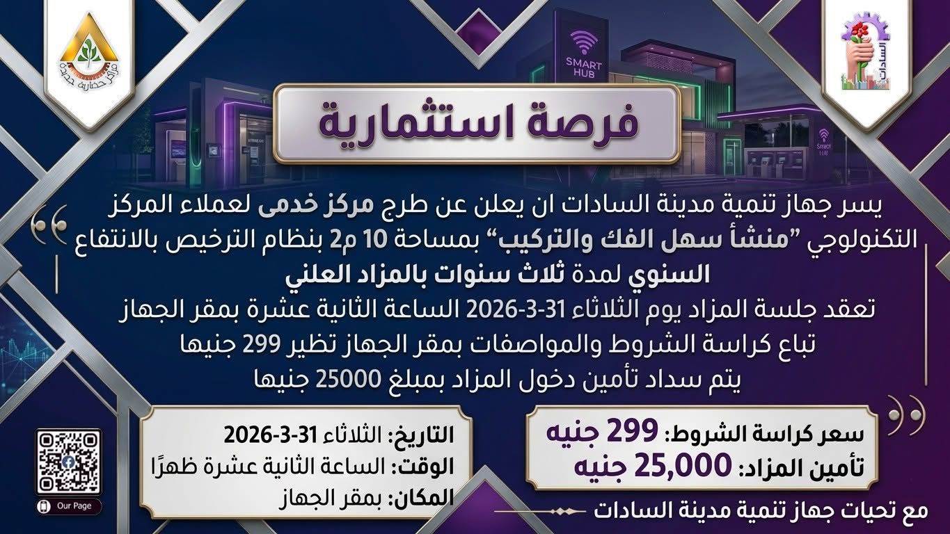 وحدد الجهاز موعد جلسة المزاد يوم الثلاثاء 31 مارس 2026 ، في تمام الساعة 12 ظهرًا، بمقر جهاز تنمية مدينة السادات، وحدد سعر كراسة الشروط 299 جنيه، و تأمين دخول المزاد 25,000 جنيه، ويتم استكمال سداد 10% من القيمة الكلية الراسي بها المزاد عن مدة الثلاث سنوات كتأمين.
