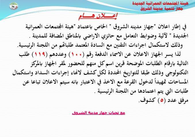 أكد جهاز مدينة الشروق أن الإعلان عن باقي الطلبات التي يتم اعتمادها من اللجنة الرئيسية سيُجرى تباعًا.