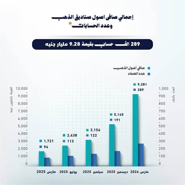 أظهرت أحدث التقارير الصادرة من الهيئة العامة للرقابة المالية، أن إجمالي قيمة صافى أصول صناديق الاستثمار في الذهب بلغ قيمته 9.28 مليار جنيه بنهاية مارس 2026، وذلك من خلال 289 ألف حساب.